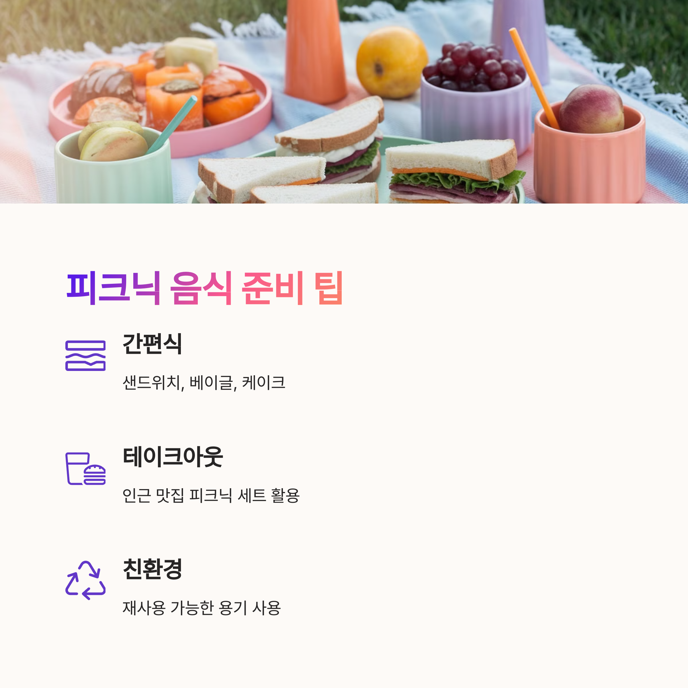 | Q. 서울숲 피크닉은 어떤 음식을 준비하는 것이 좋나요? |