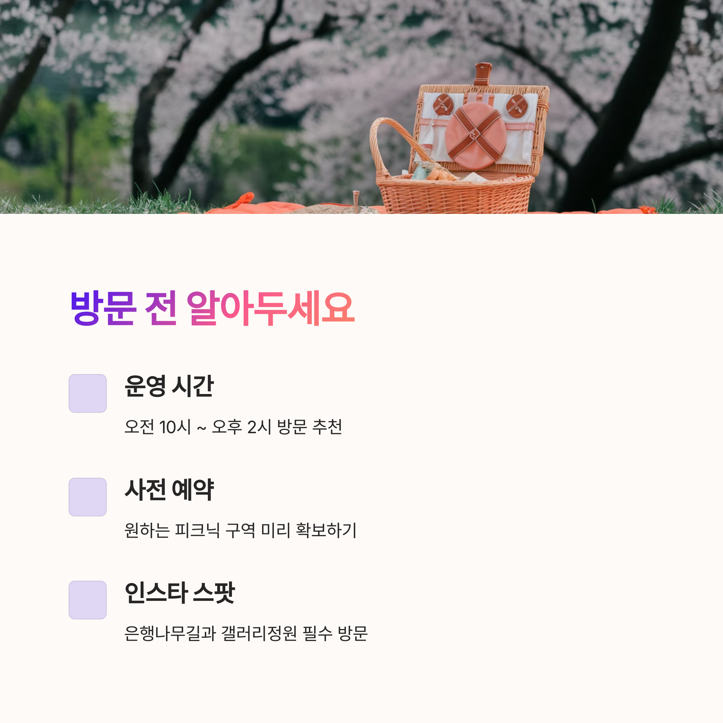 특히 봄철 방문은 만개한 꽃들과 온화한 날씨로 최고의 피크닉 시즌으로 꼽힙니다.