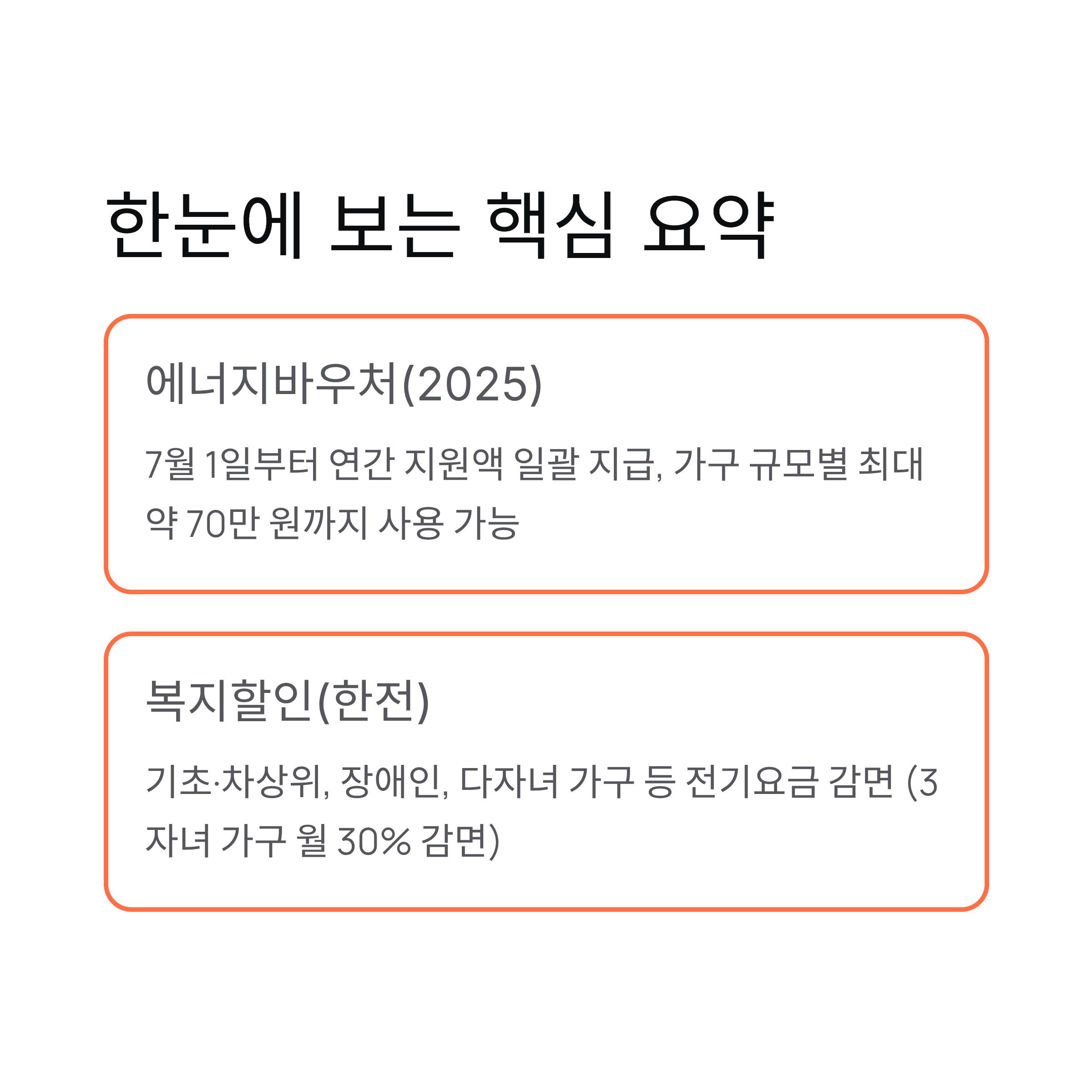 2025 여름 전기요금 이렇게 줄인다한시 지원·에너지바우처·복지할인 총정리 한눈에 보는 핵심 요약에너지바우처(2025): 7월 1일부터 연간 지원액을 일괄 지급, 가구 규모별로 최대 약 70만 원 수준까지 사용 가능(하절기·동절기 구분 없이 기간 내 자유 사용). 정부가 폭염 취약계층 지원을 강화 중.복지할인(한전): 기초·차상위, 장애인, 다자녀/대가족, 생명유지장치 사용 가구 등에 전기요금 감면 제공. 예시로 서울시 안내 기준 3자녀 가구 월 30% 감면(최대 16,000원).신청 창구: 에너지바우처는 주민센터·복지로 등, 복지할인은 한전 고객센터 123 / 사이버지점에서 가능.1) 에너지바우처 2025: 올해 뭐가 달라졌나?정부는 폭염·혹한 시 취약계층의 냉난방비 부담을 줄이기 위해 에너지바우처를 ..