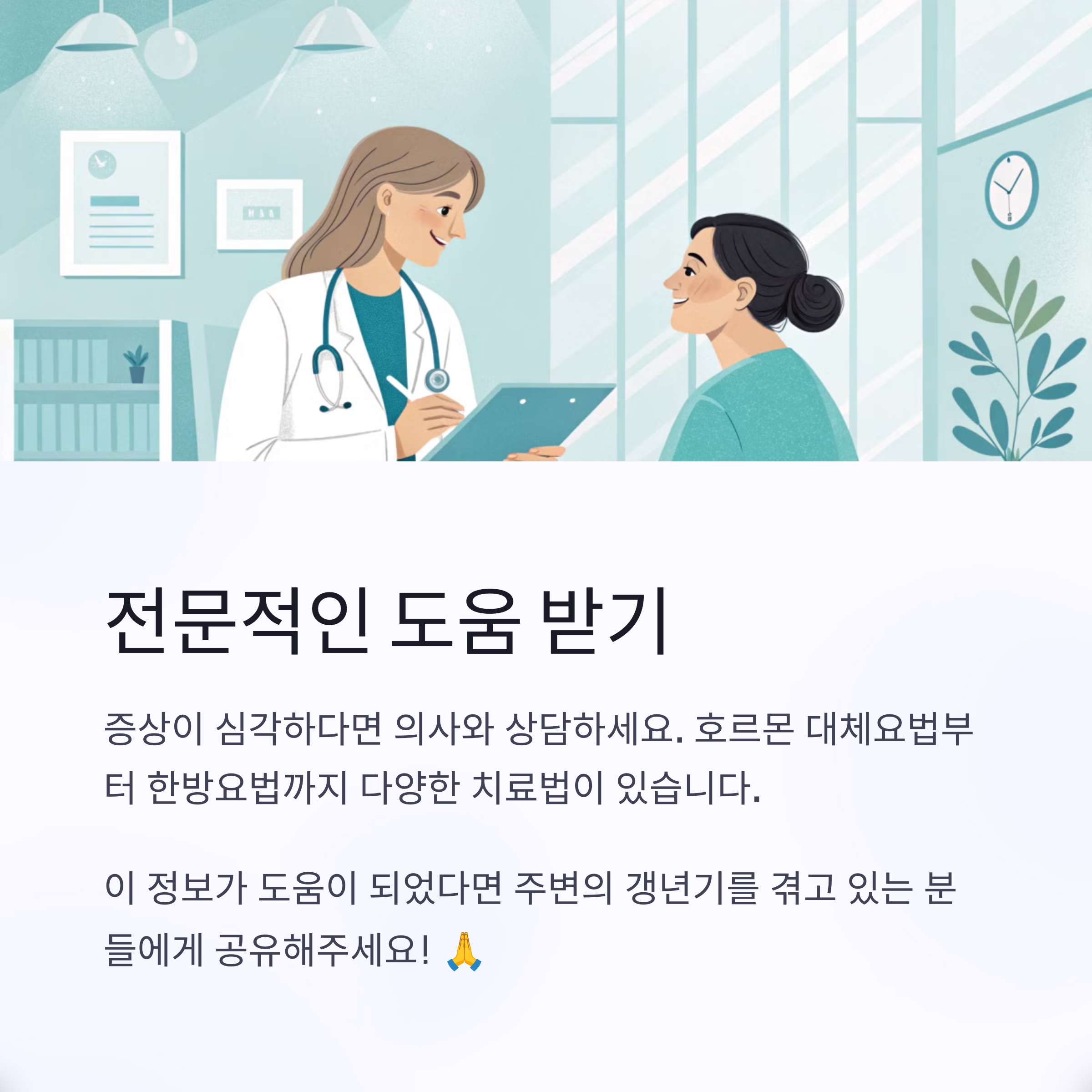 갱년기는 병이 아니라 자연스러운 변화입니다. 하지만 그 증상이 심하거나 일상생활에 영향을 미친다면 대처법을 알고 실천하는 것이 중요합니다.