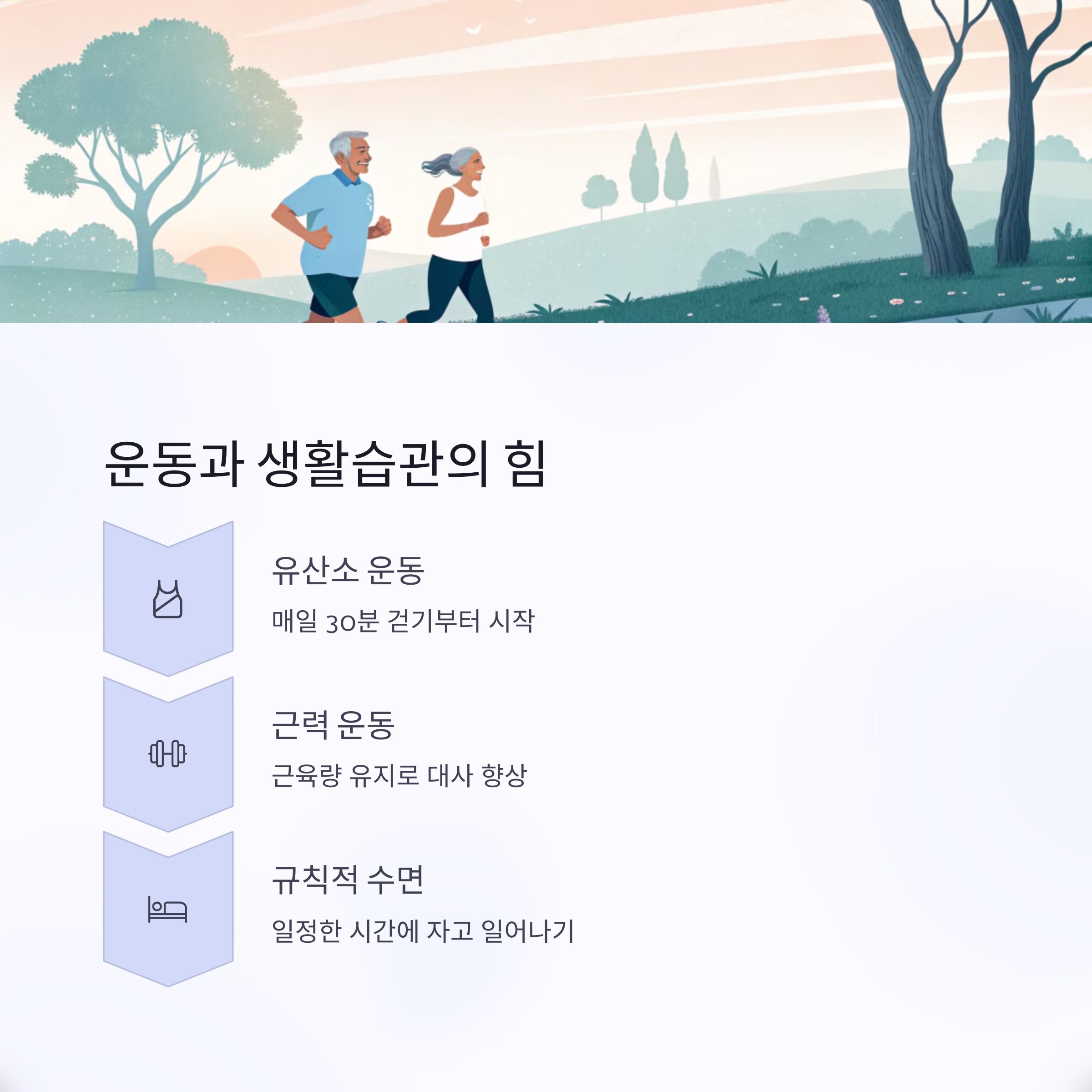 생활 전반에서 규칙성과 절제력이 핵심입니다. 흡연과 음주를 줄이고, 몸의 신호에 귀 기울이는 습관을 들여야 합니다.
