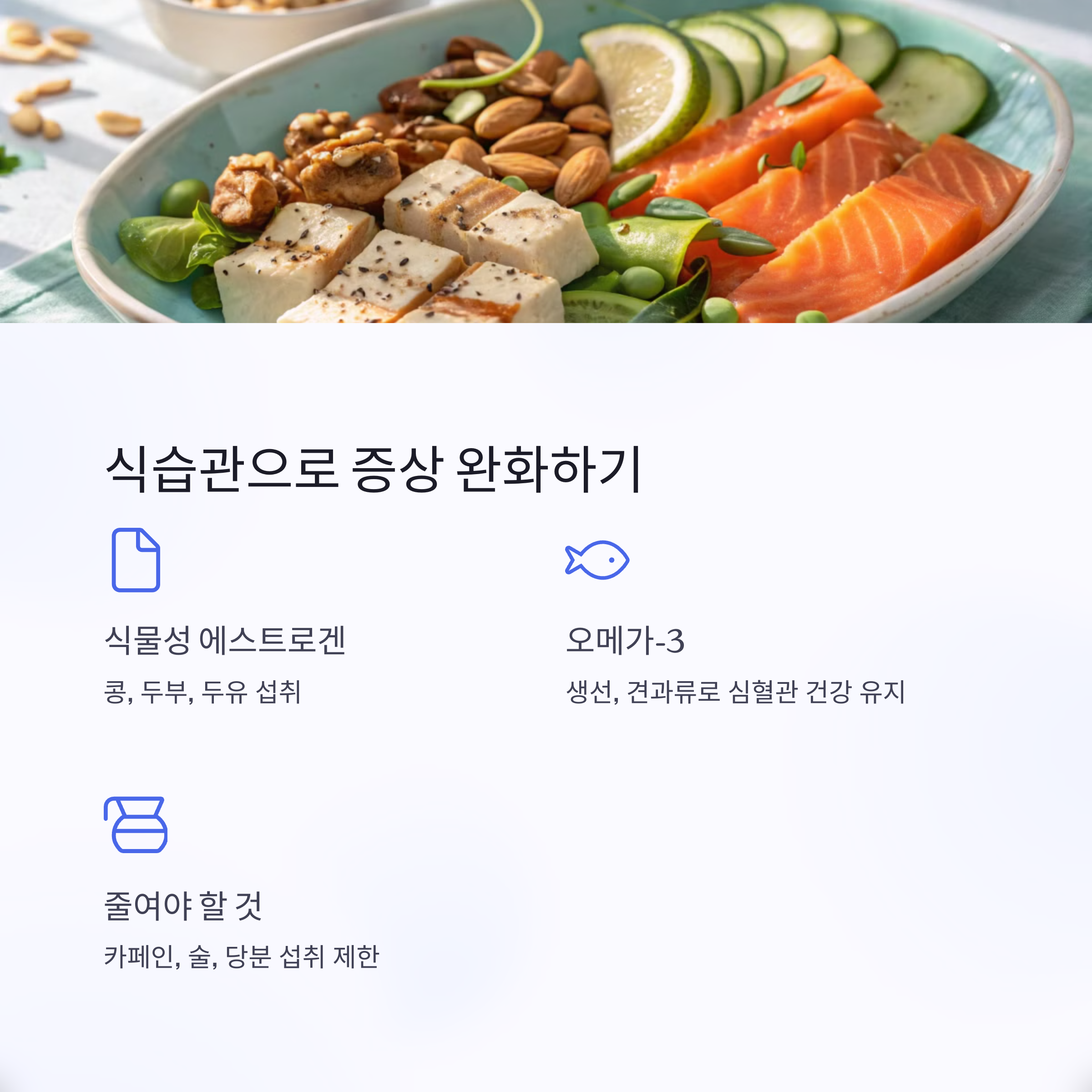 남성은 단백질 섭취를 통해 근육량 유지에 신경 써야 하며, 적절한 아연과 셀레늄 섭취가 호르몬 균형을 돕습니다. 카페인, 술, 지나친 당분은 증상을 악화시킬 수 있으므로 줄이는 것이 좋습니다.