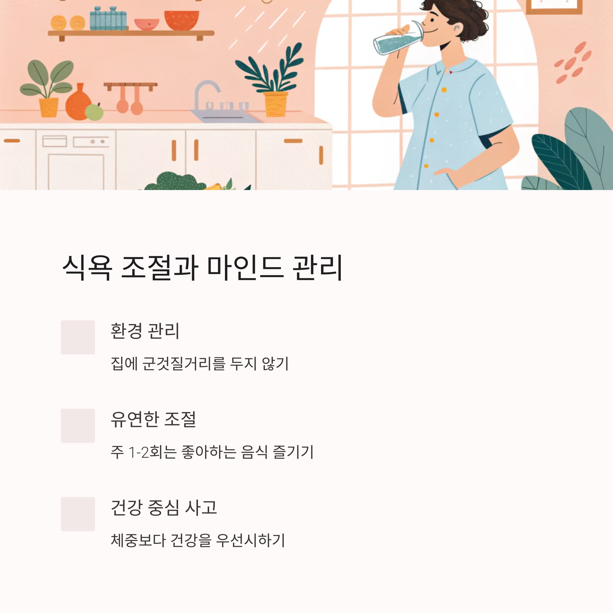 40대 이후의 다이어트는 ‘의지’보다는 ‘환경 관리’가 더 중요합니다. 집에 군것질거리를 두지 않고, 식사 전에 물을 한 잔 마시는 것만으로도 과식을 줄일 수 있습니다.