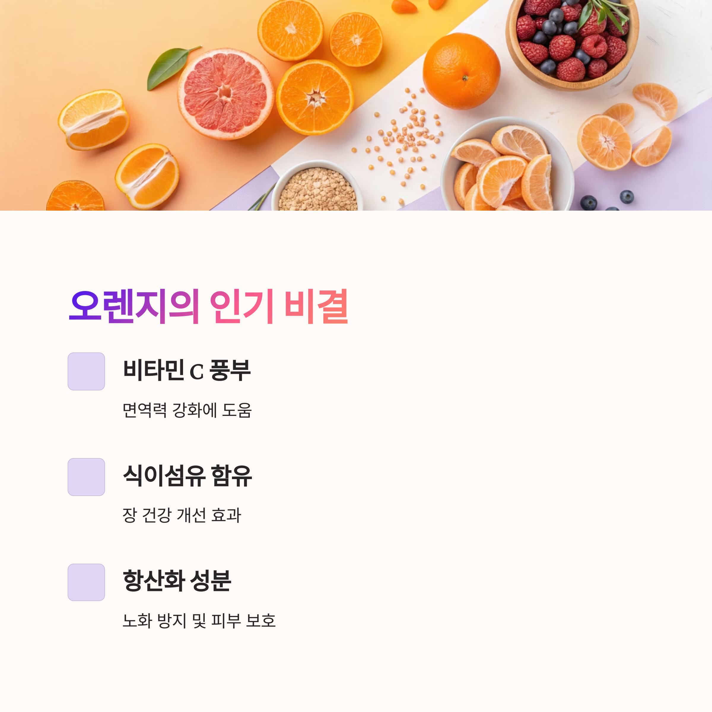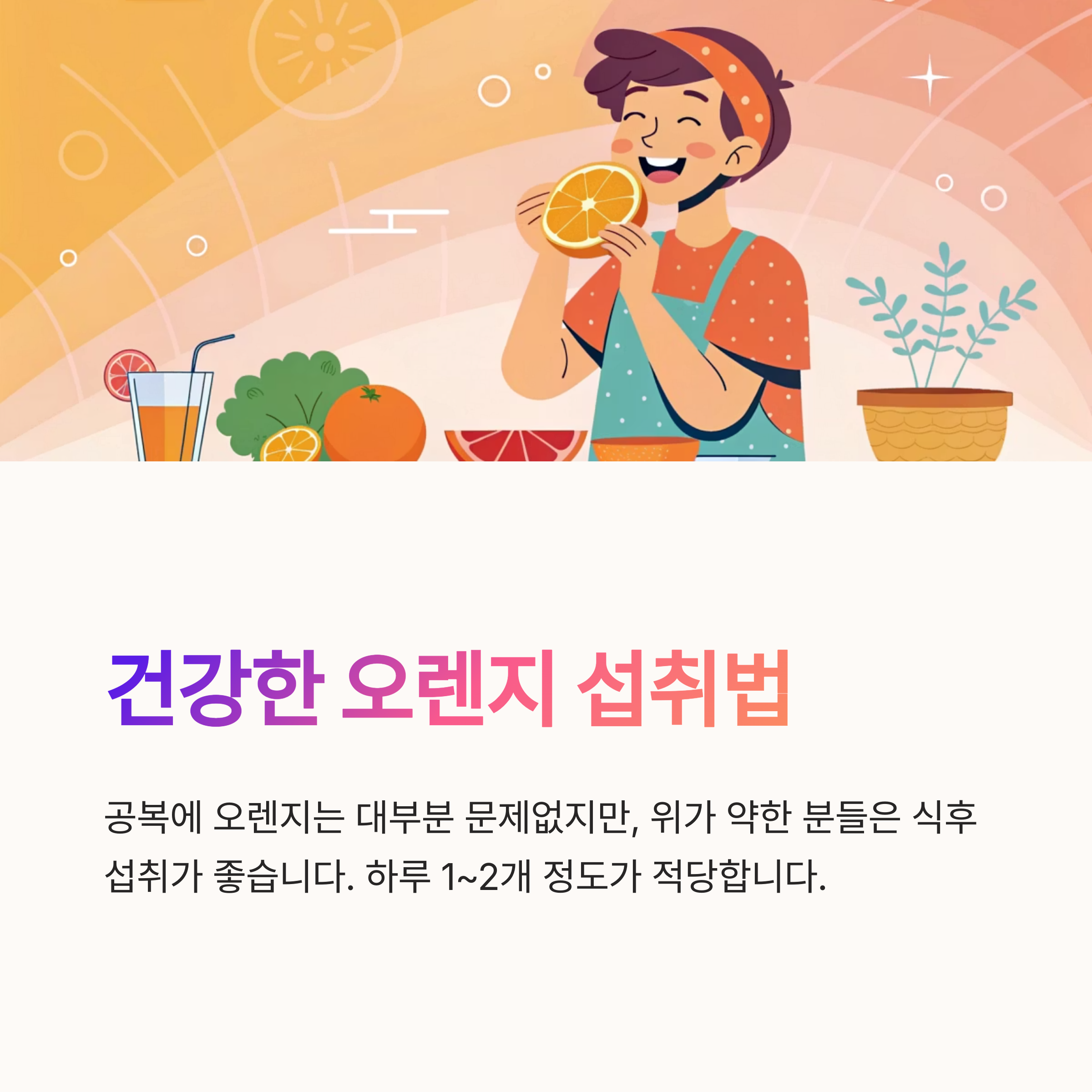 공복에 오렌지 섭취는 대부분 문제없지만, 위가 약한 분들은 식후 섭취를 추천합니다. 오렌지는 하루 1~2개 정도 섭취하면 면역력 강화, 피부 건강, 소화 개선에 큰 도움이 됩니다. 과유불급! 적당히 섭취하며 건강 루틴에 자연스럽게 녹여보세요.