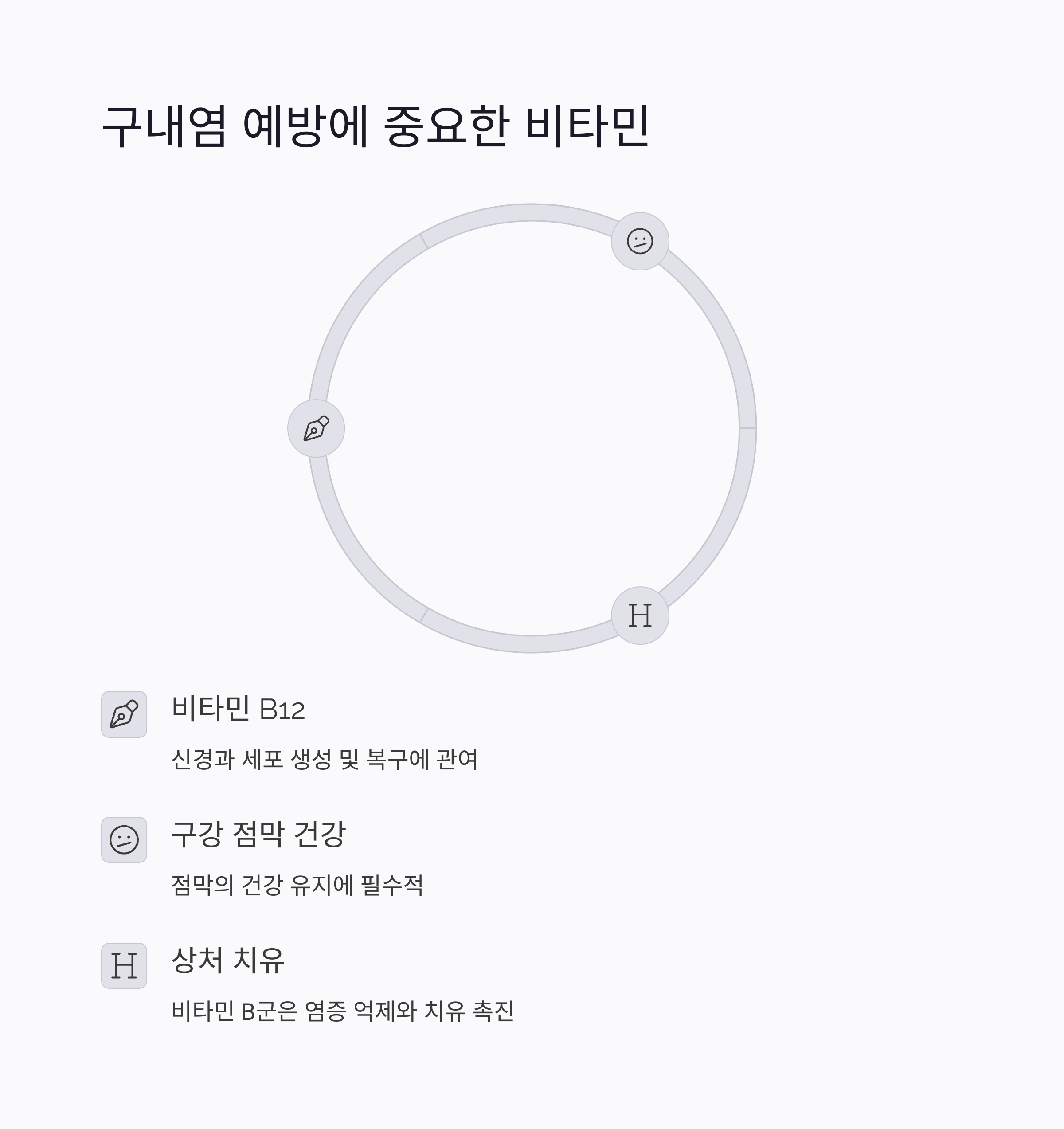 | Q. 구내염 예방을 위한 가장 중요한 비타민은 무엇인가요? |
