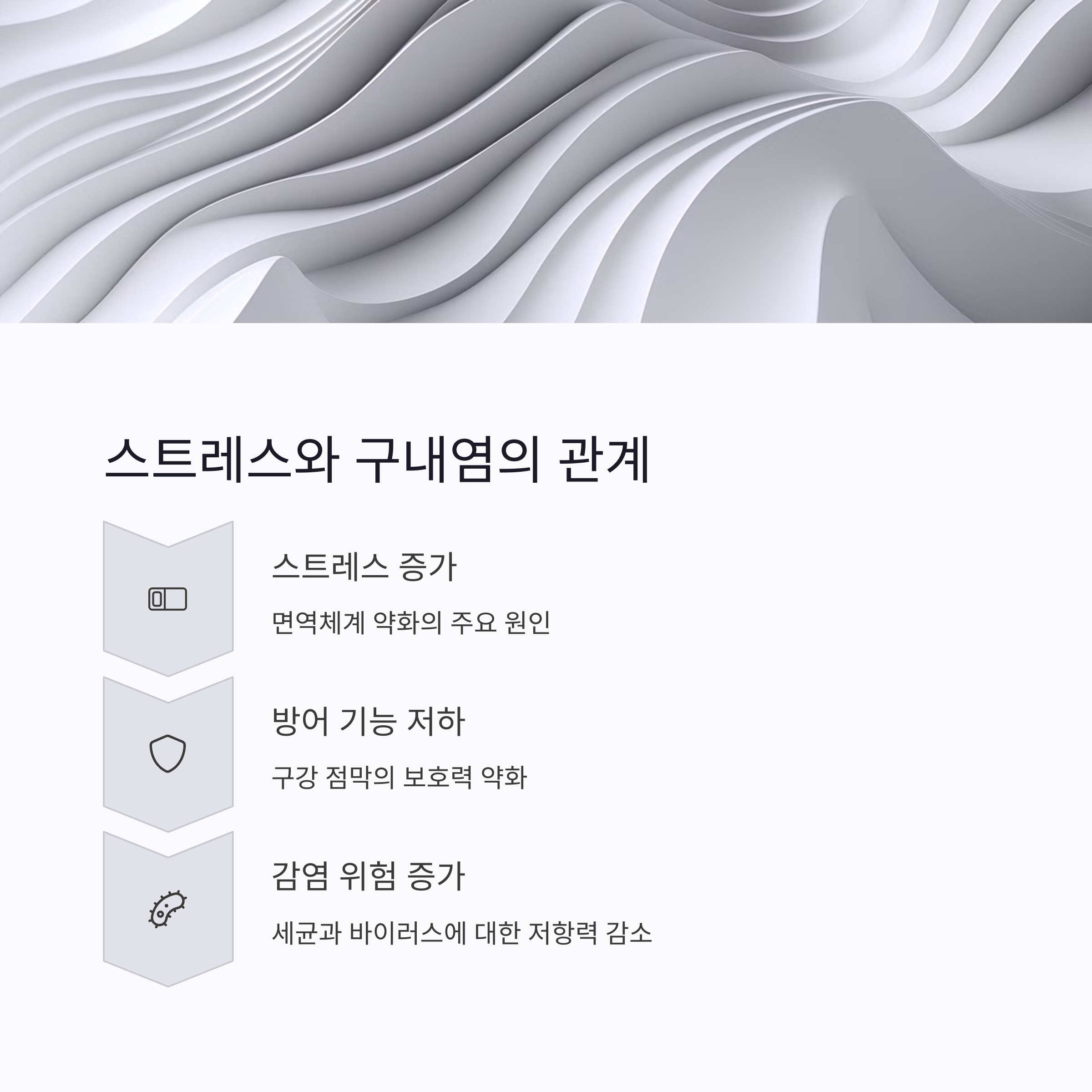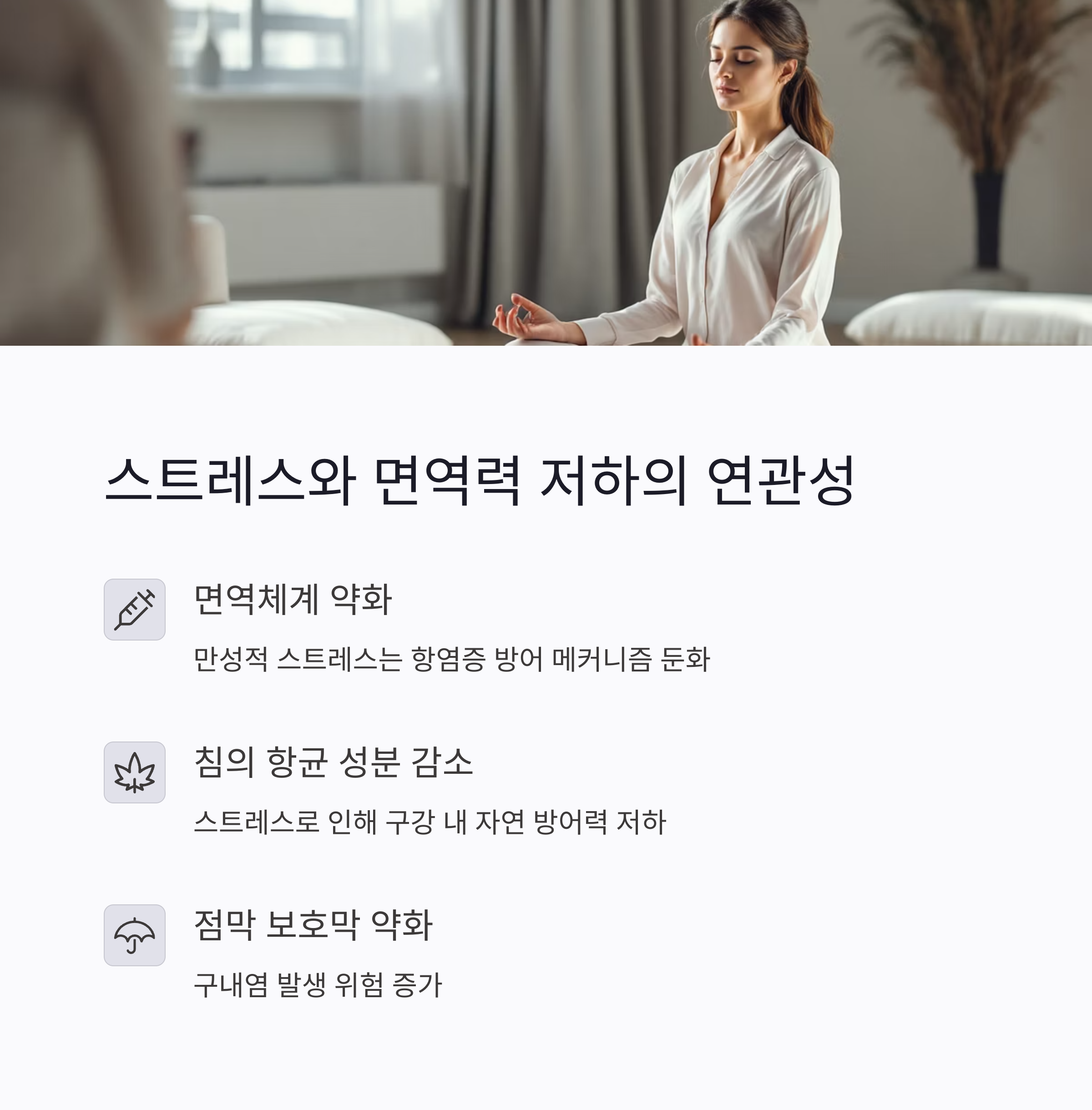 스트레스로 인해 침의 항균 성분과 점막의 보호막이 약화되며, 이로 인해 구내염이 발생하기 쉽습니다.