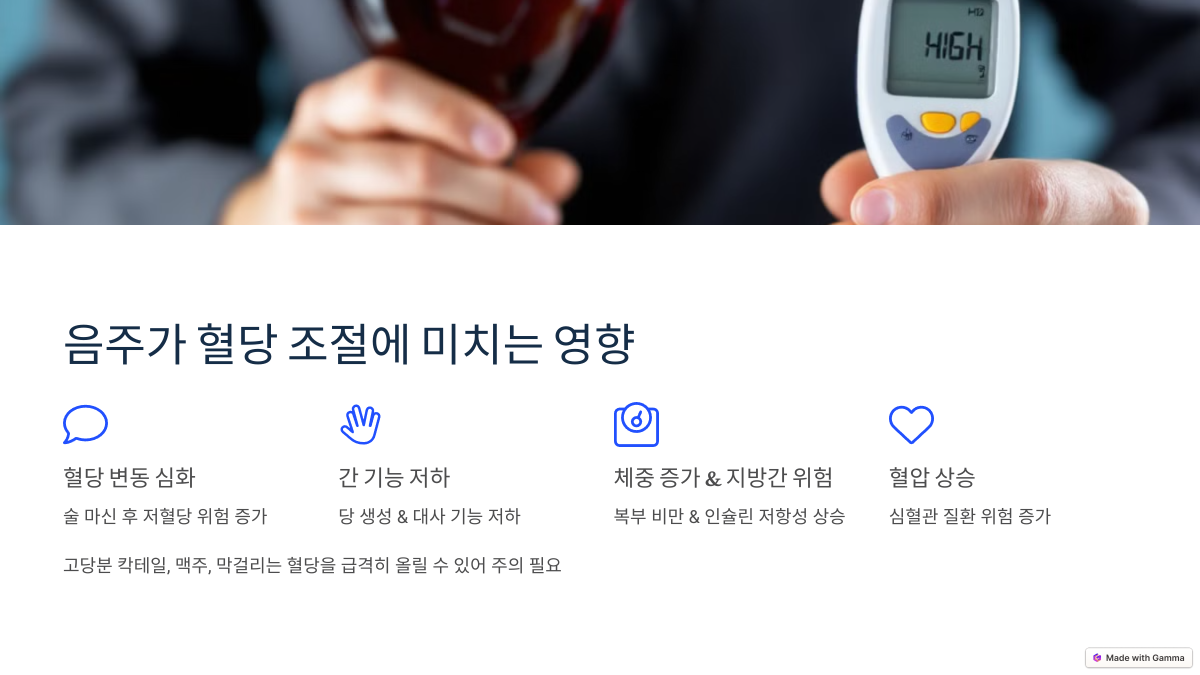 과음은 혈당 조절을 어렵게 만들고, 장기적으로 건강에 악영향을 줄 수 있어요.
