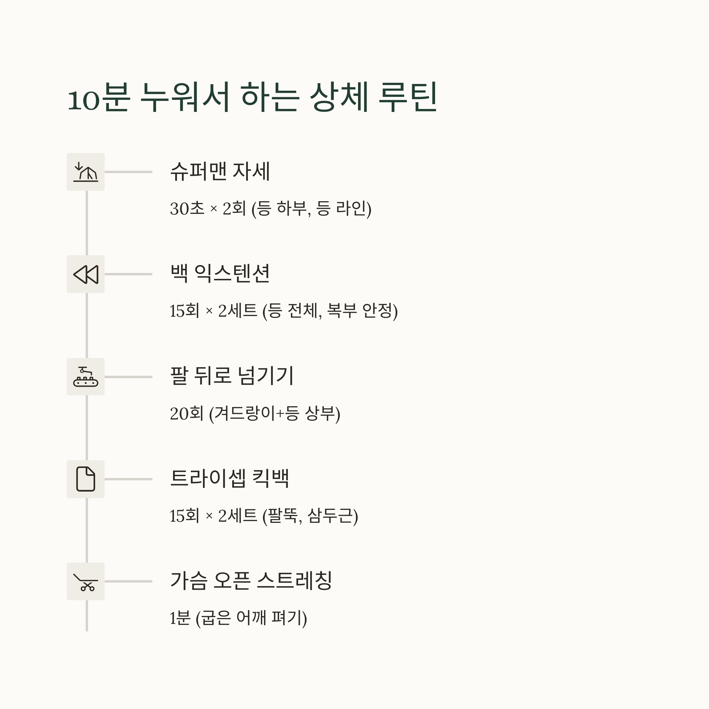 바닥에 누운 채 진행하는 동작들로, 등·팔·어깨 라인 정리에 효과적입니다. 하루 10분이면 충분해요.