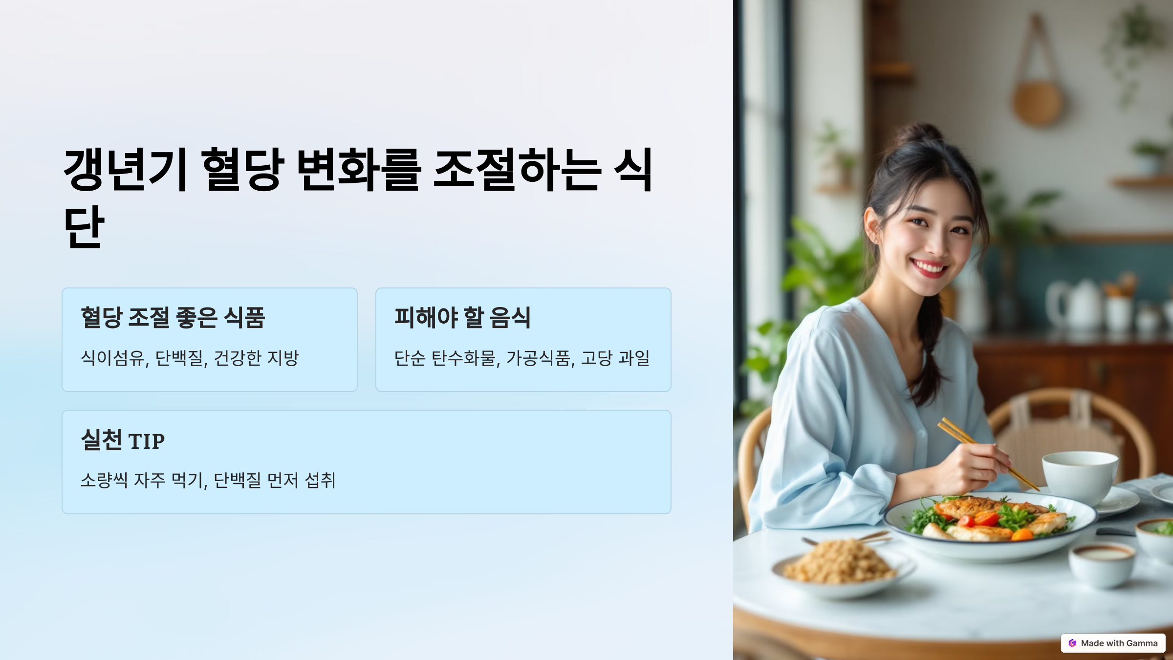 호르몬 변화를 겪는 시기에는 혈당 스파이크를 최소화하는 식습관이 필수입니다.