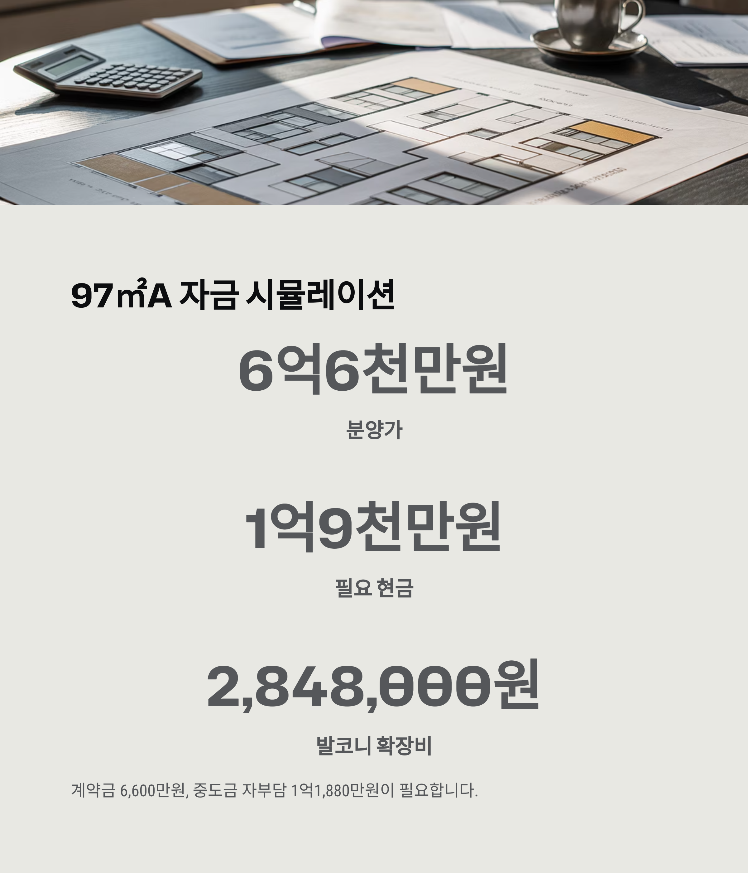 이번 글에서는 대표적인 실수요 평형인 84㎡A형과 97㎡A형 기준으로 자금 계획 시뮬레이션을 해보겠습니다.
