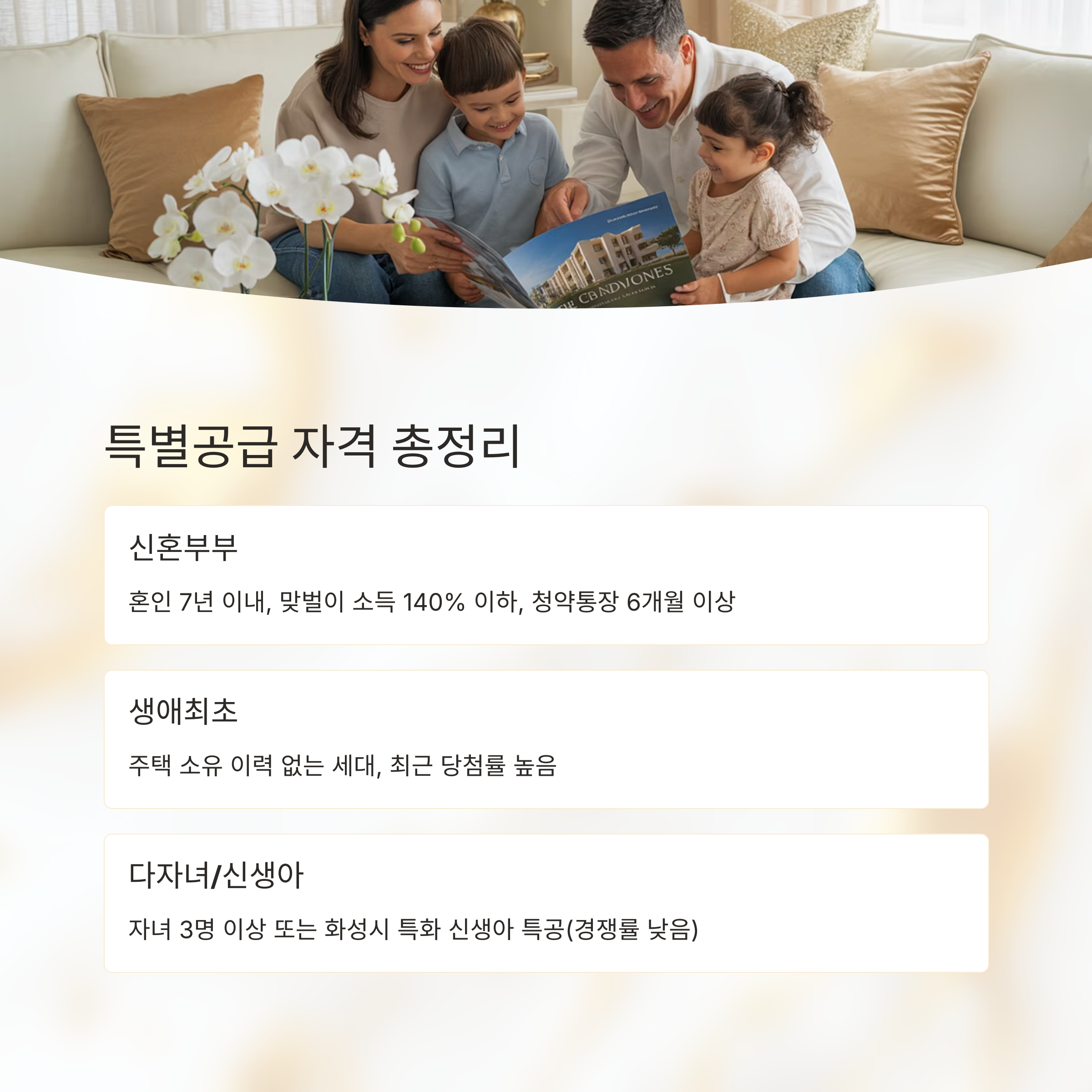 - 특별공급 적극 활용 (신혼부부, 생애최초, 다자녀 등)