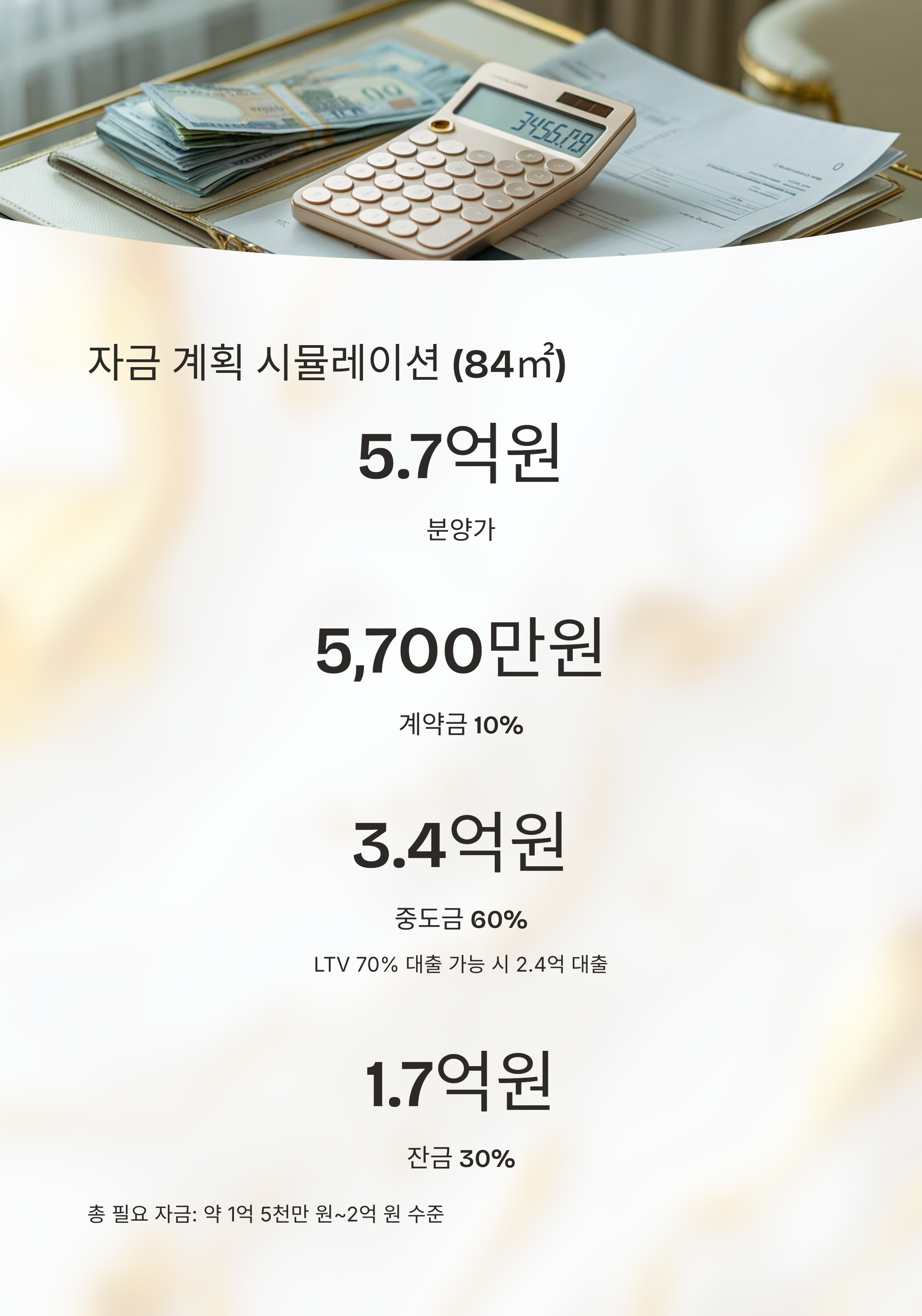 - 중도금 60%: 3억 4,200만원 (LTV 70% 대출 가능 시 2.4억 대출, 자비 약 1억 필요)
