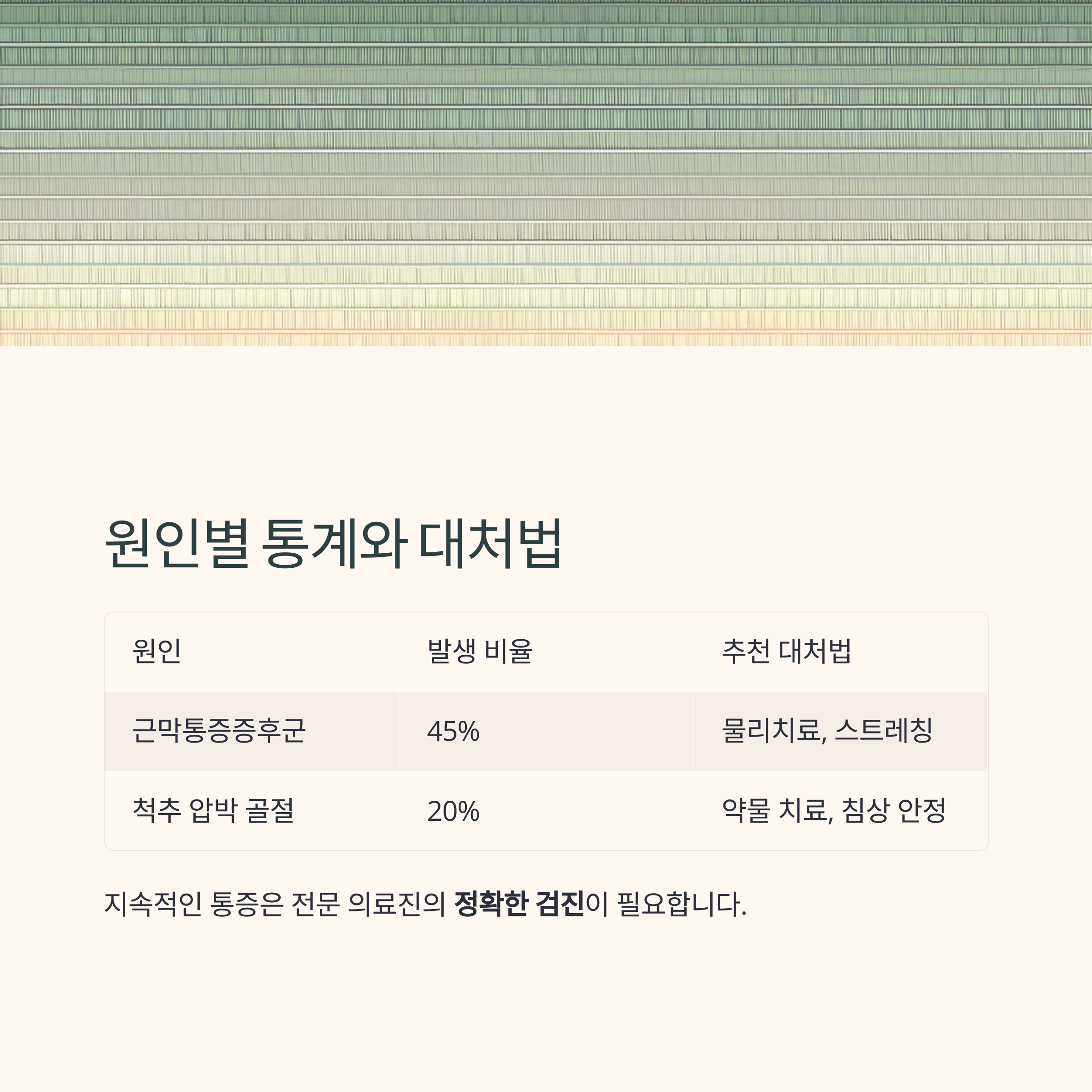 | 근막통증증후군 | 45% | 즉시 | 물리치료, 스트레칭 |