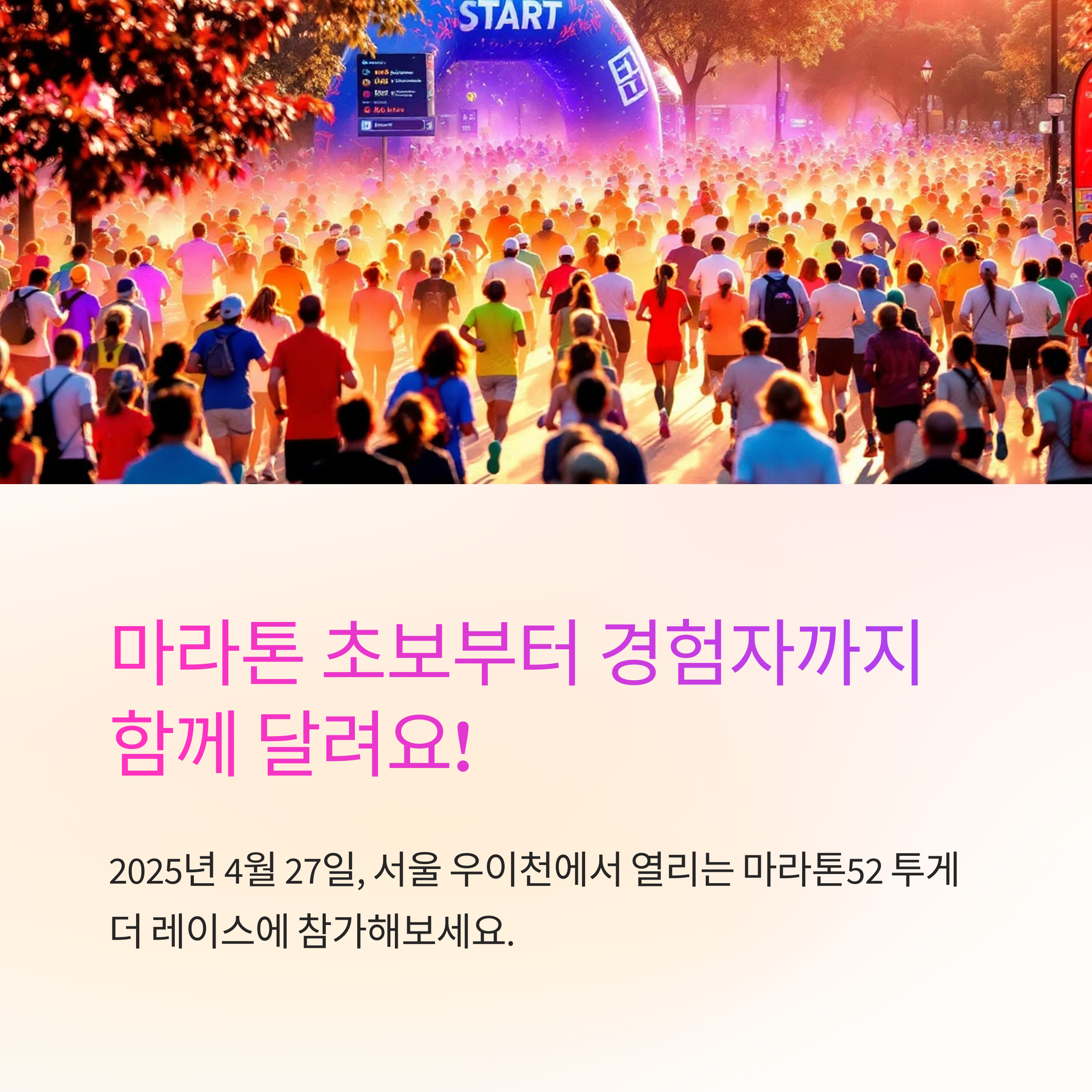 마라톤52 투게더 레이스 2025는 가볍게, 함께, 꾸준히를 실천하는 러닝 커뮤니티입니다.