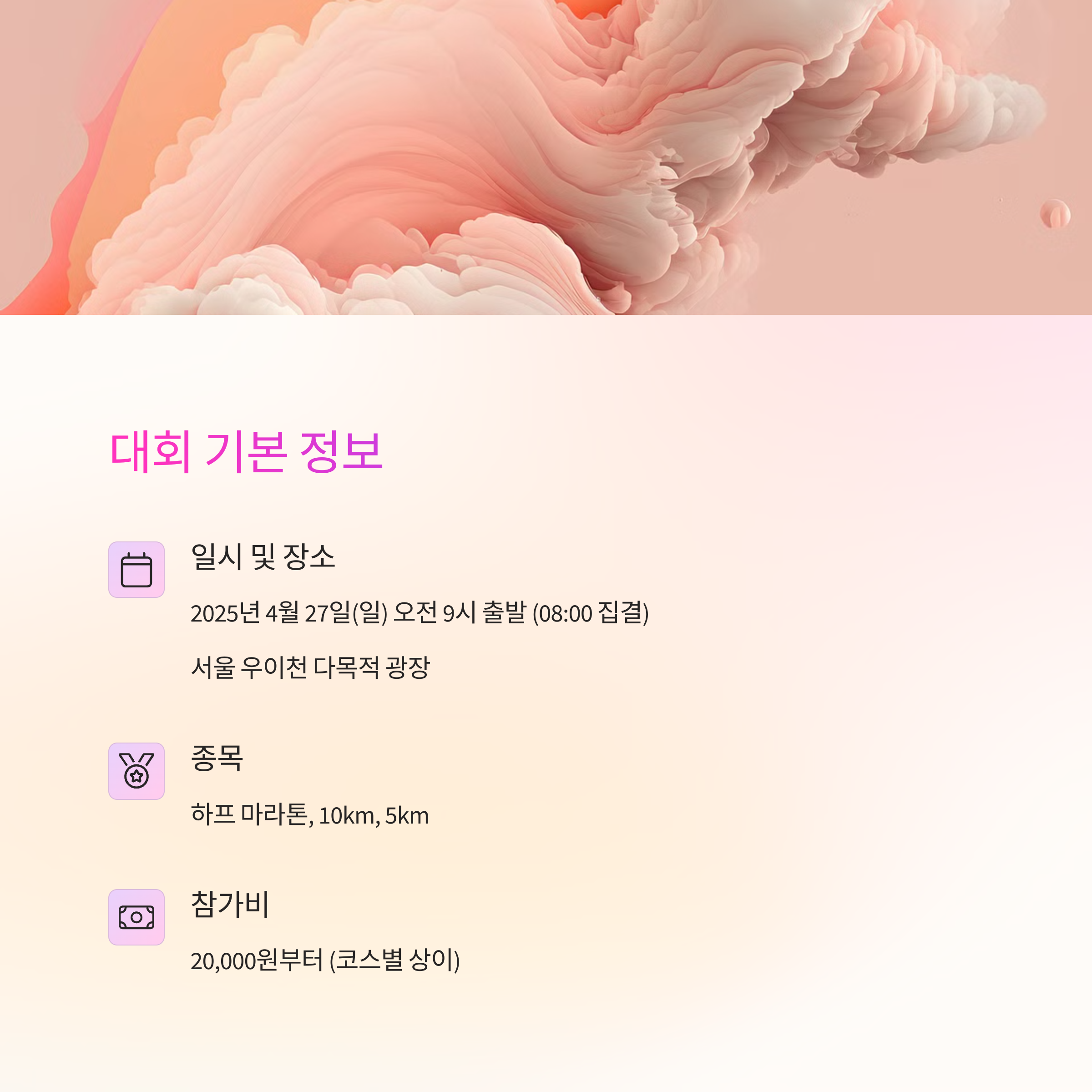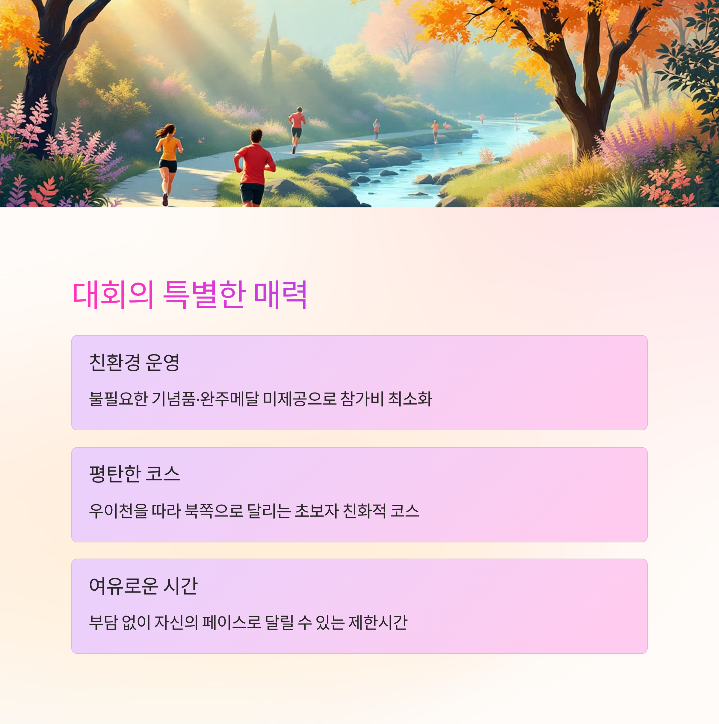 | 참가 코스 | 하프 / 10km / 5km | 평탄한 우이천 러닝 코스 |