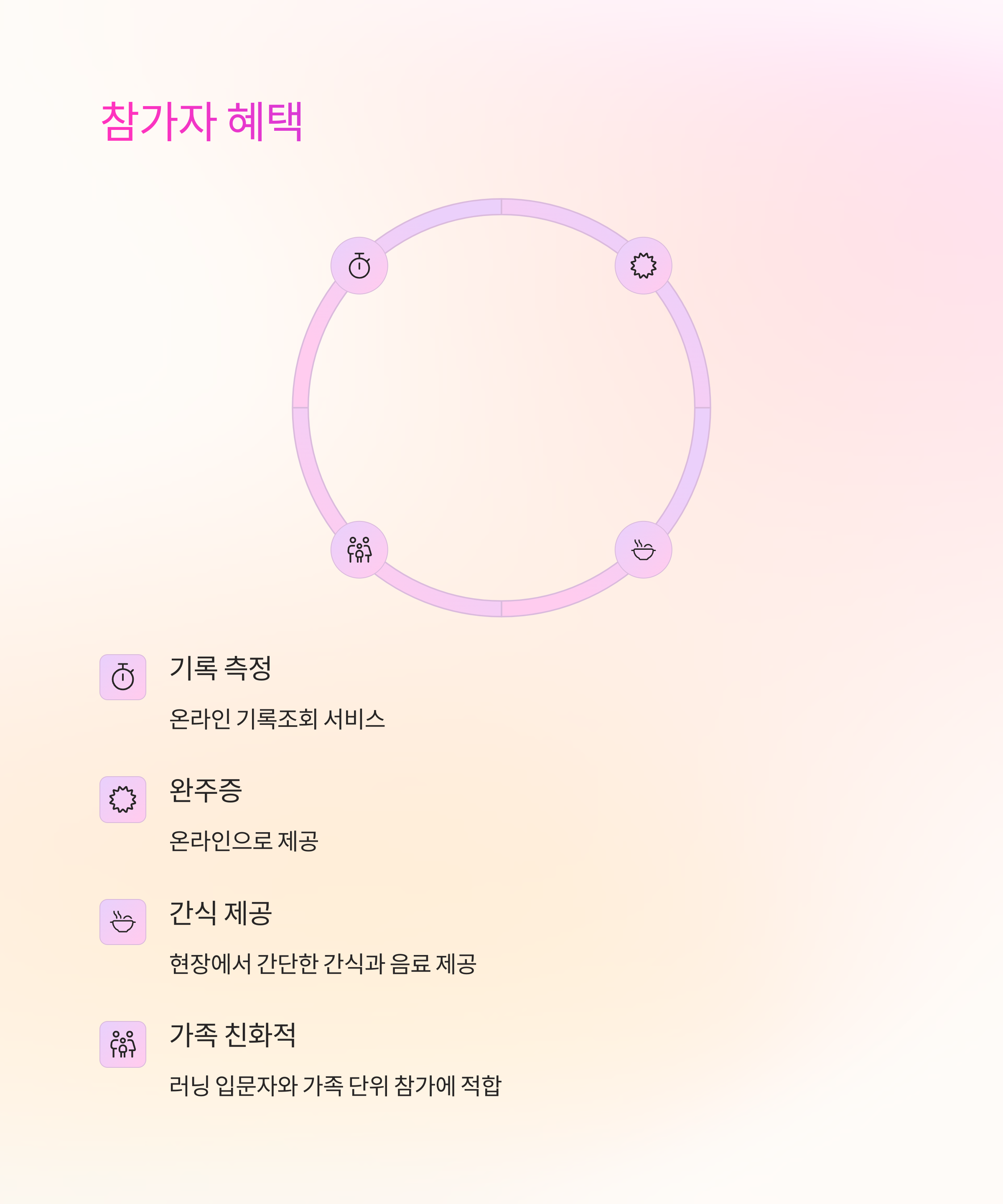 참가자는 공식 홈페이지에서 사전 접수하며 현장에서는 간단한 간식과 음료가 제공됩니다. 기록은 온라인으로 확인할 수 있으며 완주증도 마찬가지로 디지털 방식으로 발급됩니다.