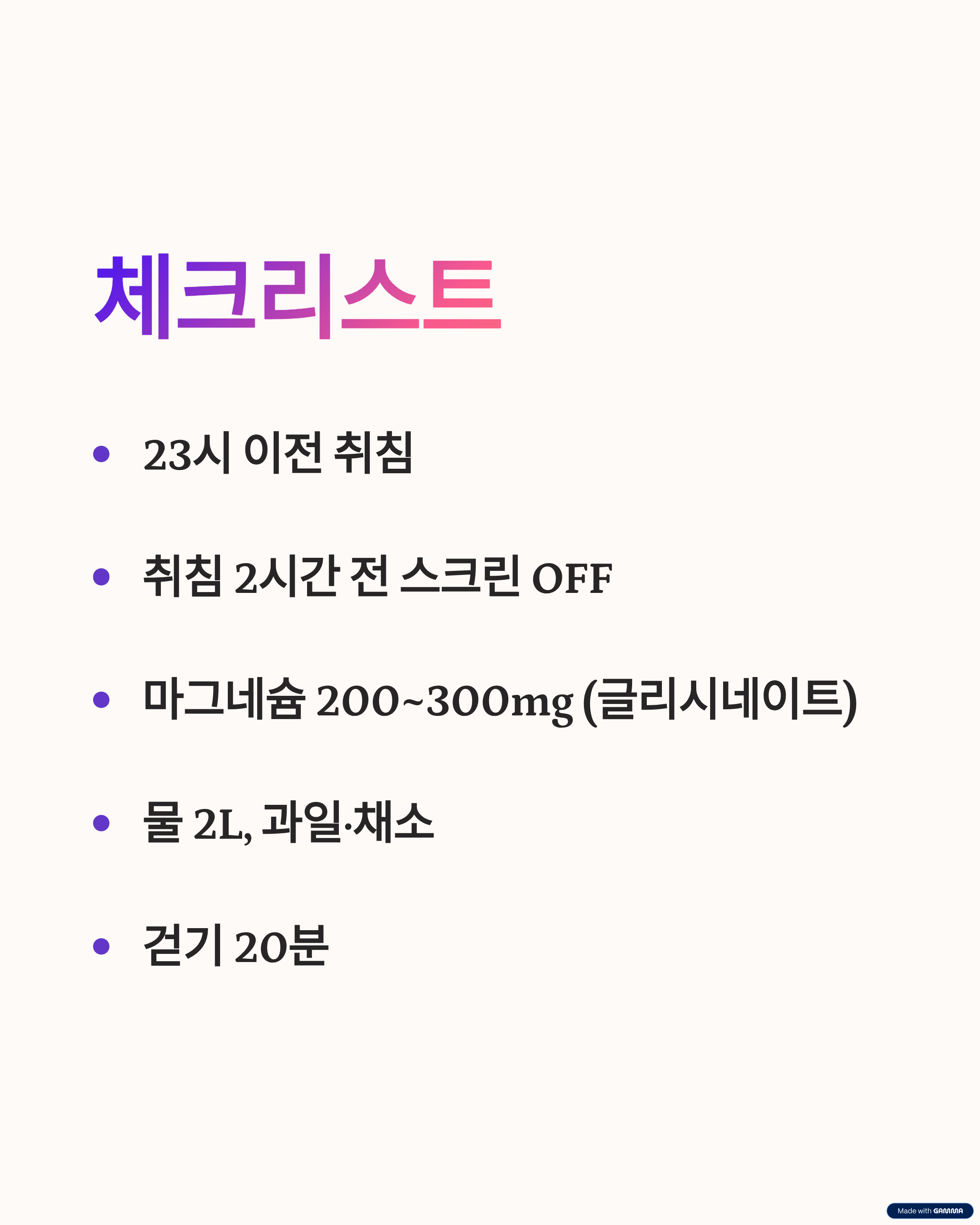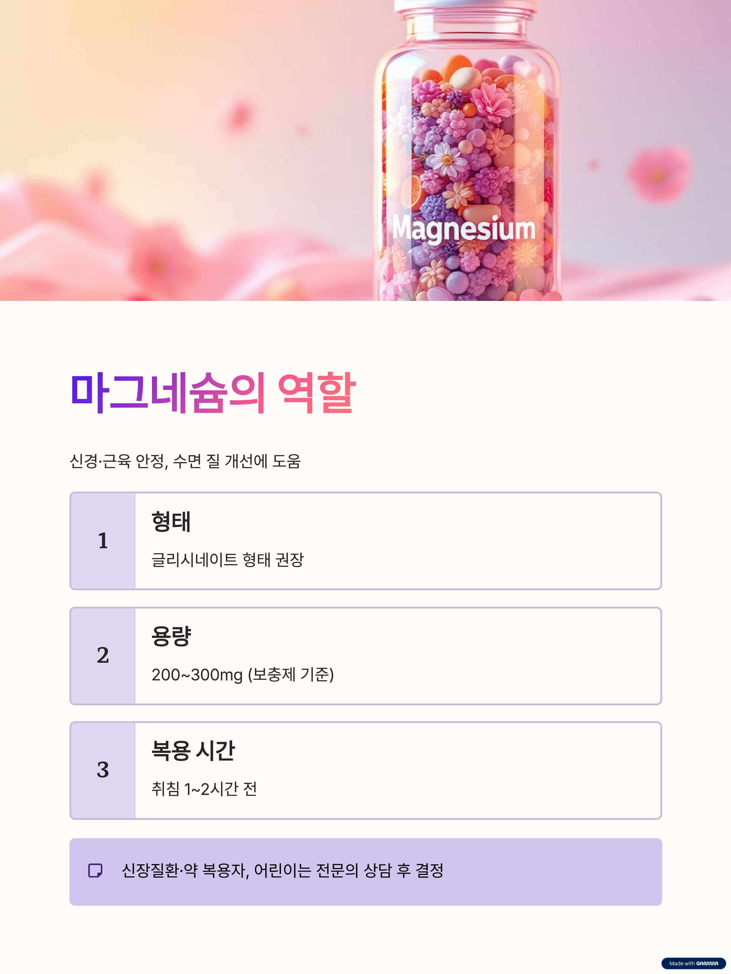 - 글리시네이트 형태부터 200~300mg(보충제 기준), 취침 1~2시간 전