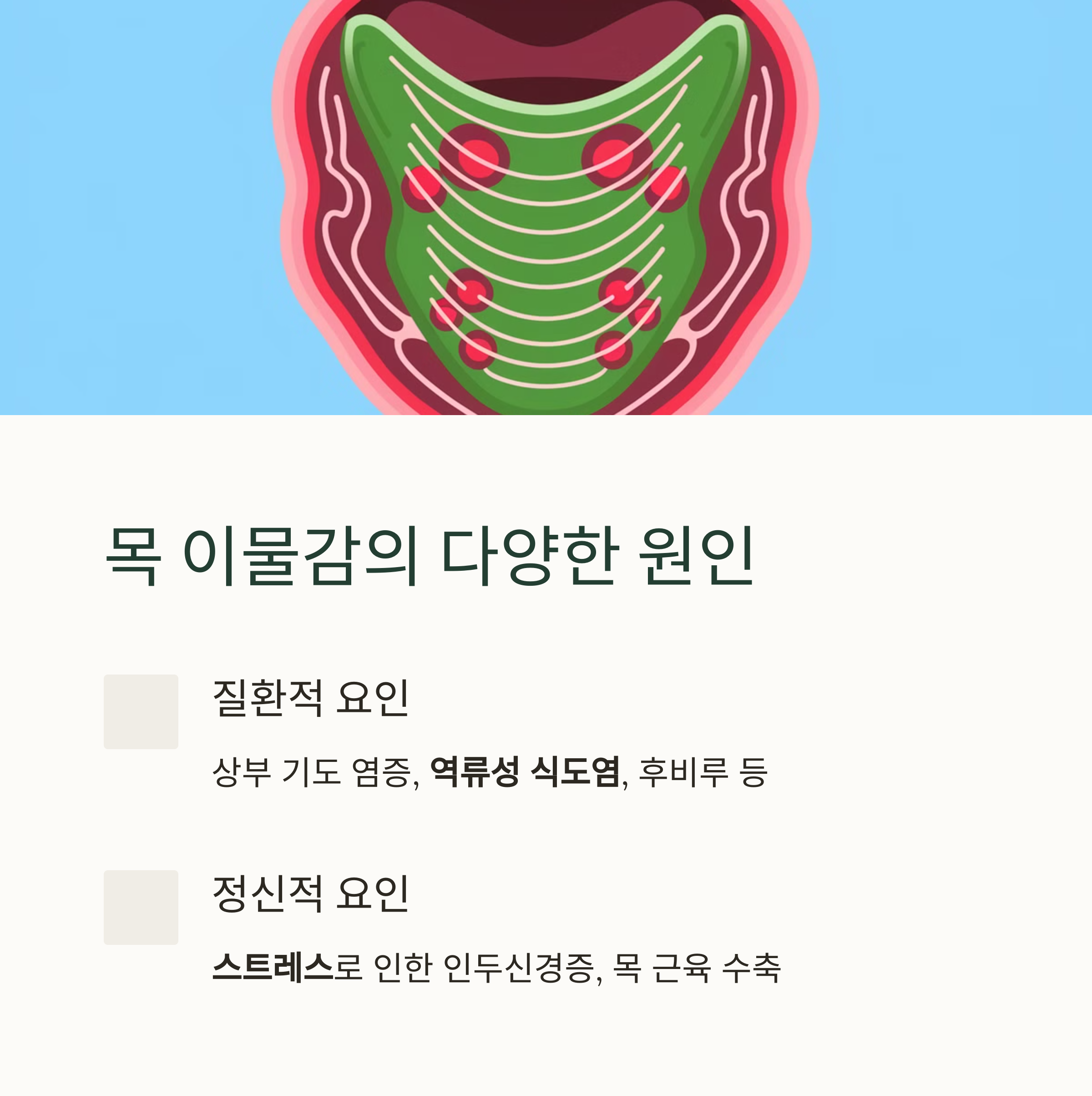 목 이물감의 원인은 질환적 요인과 정신적 요인으로 나뉩니다.