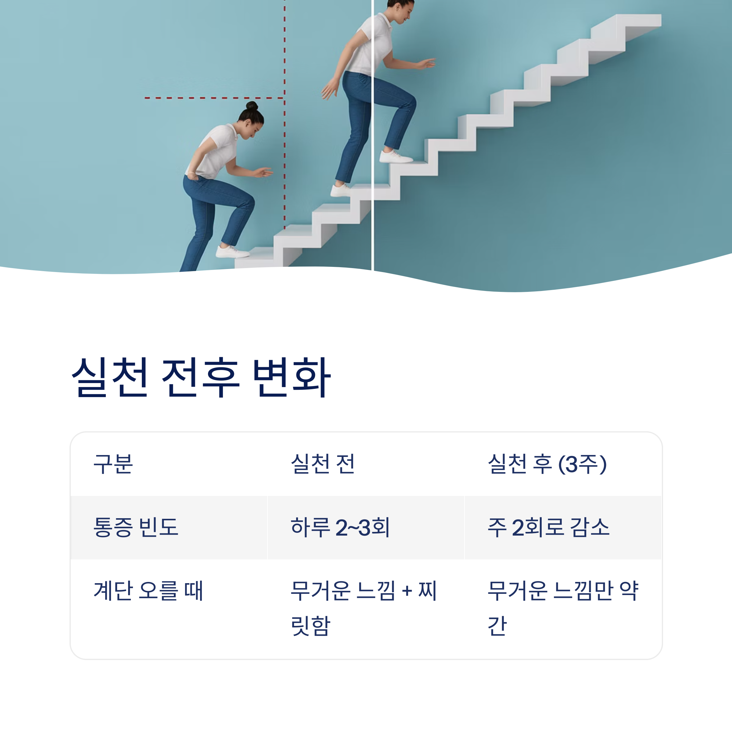 | 계단 오를 때 통증 | 무거운 느낌 + 찌릿함 | 무거운 느낌만 약간 |