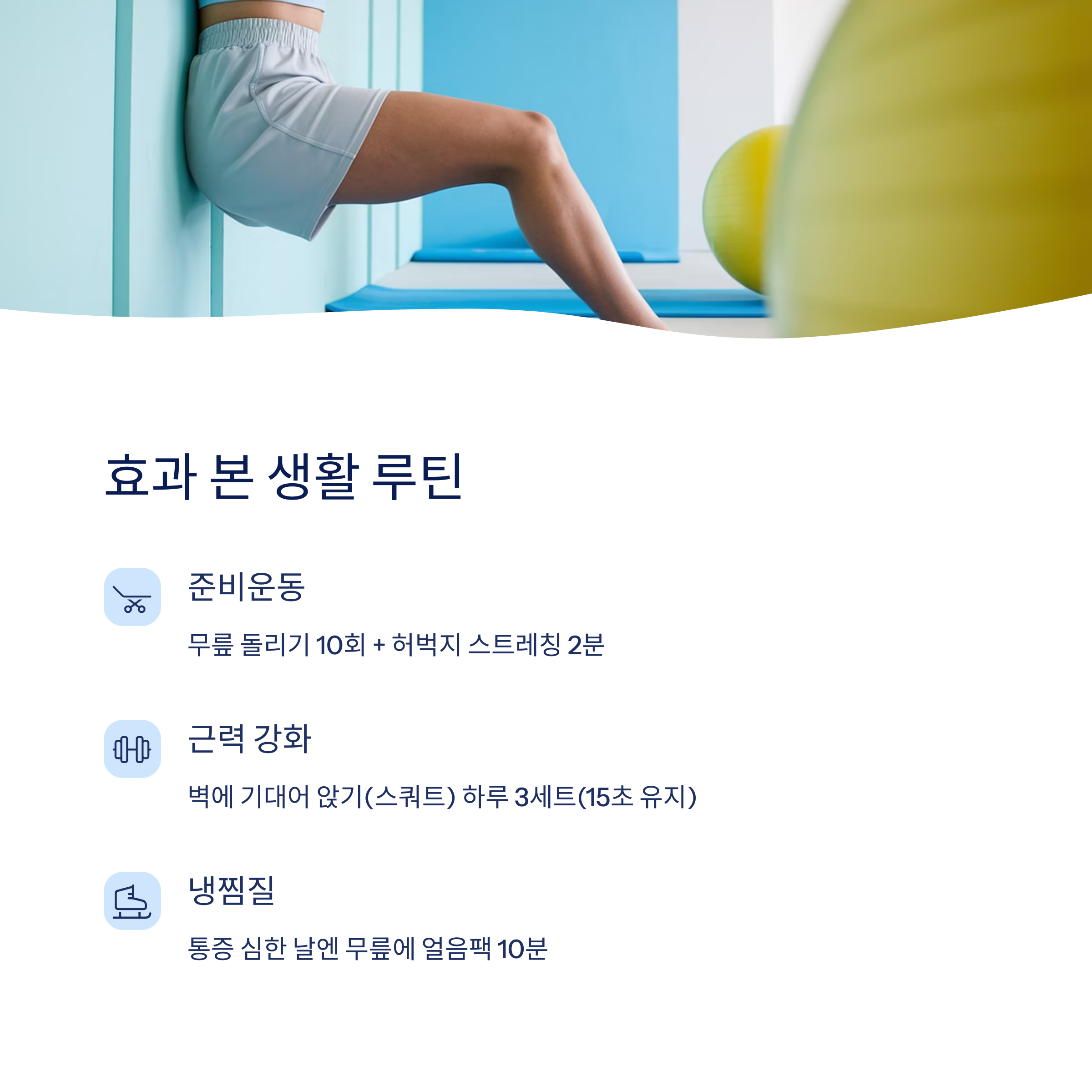 - ✔ 무릎 근력 강화 운동: 벽에 기대어 앉기(스쿼트) 하루 3세트(15초 유지)