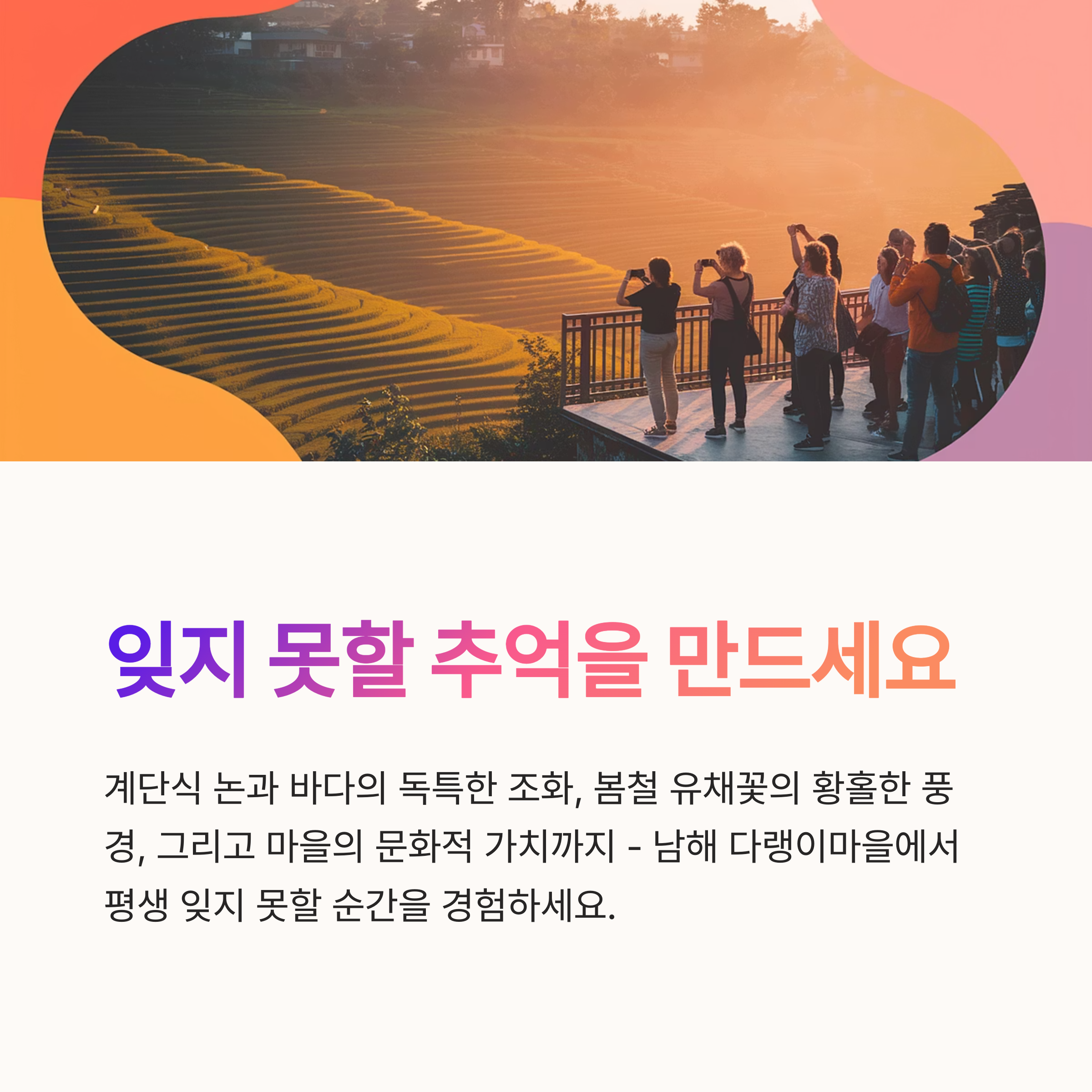 방문 후, 다음을 계획하는 여행지로 남해 다랭이마을을 떠올리게 될 것입니다.