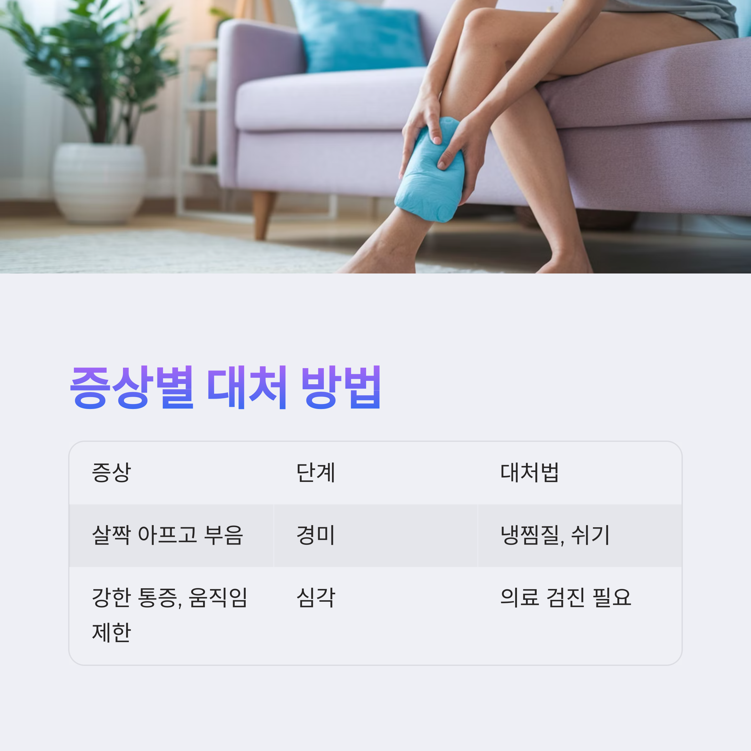 | 살짝 아프고 부음 | 경미 | 타박상 | 냉찜질, 쉬기 |