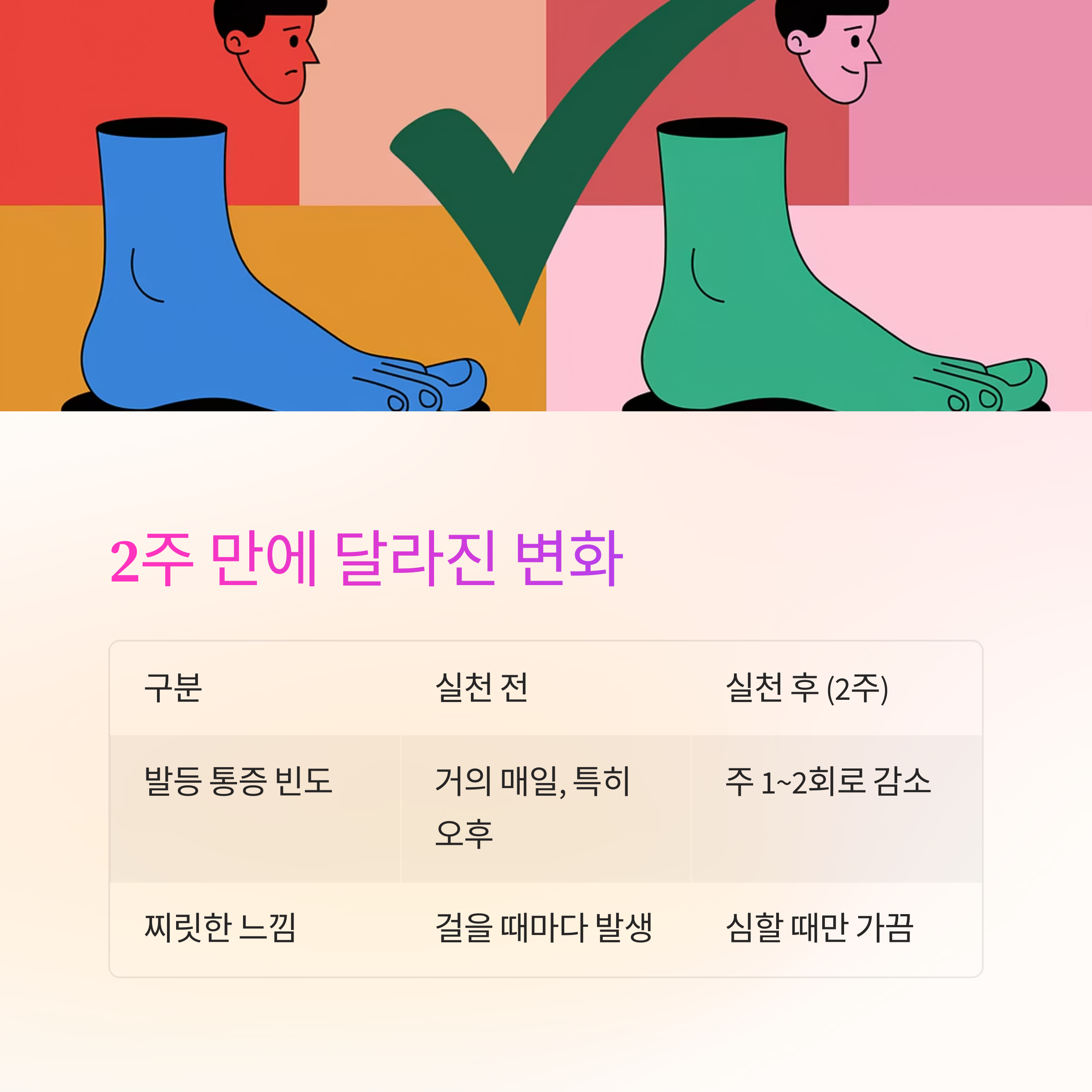 발등 통증 빈도 | 거의 매일, 특히 오후 | 주 1~2회로 감소 |