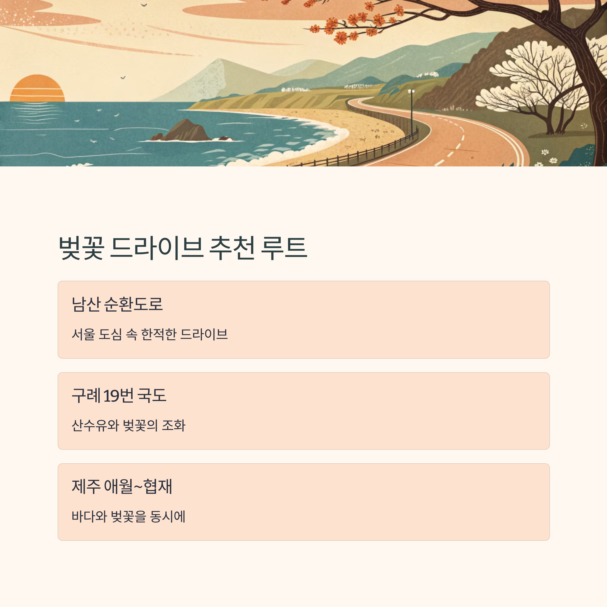 반면, 드라이브 코스는 '붐비는 건 싫다'는 분들에게 딱입니다. 차 안에서 음악 들으며 벚꽃길을 따라 천천히 달리는 것만으로도 힐링이 되거든요.
