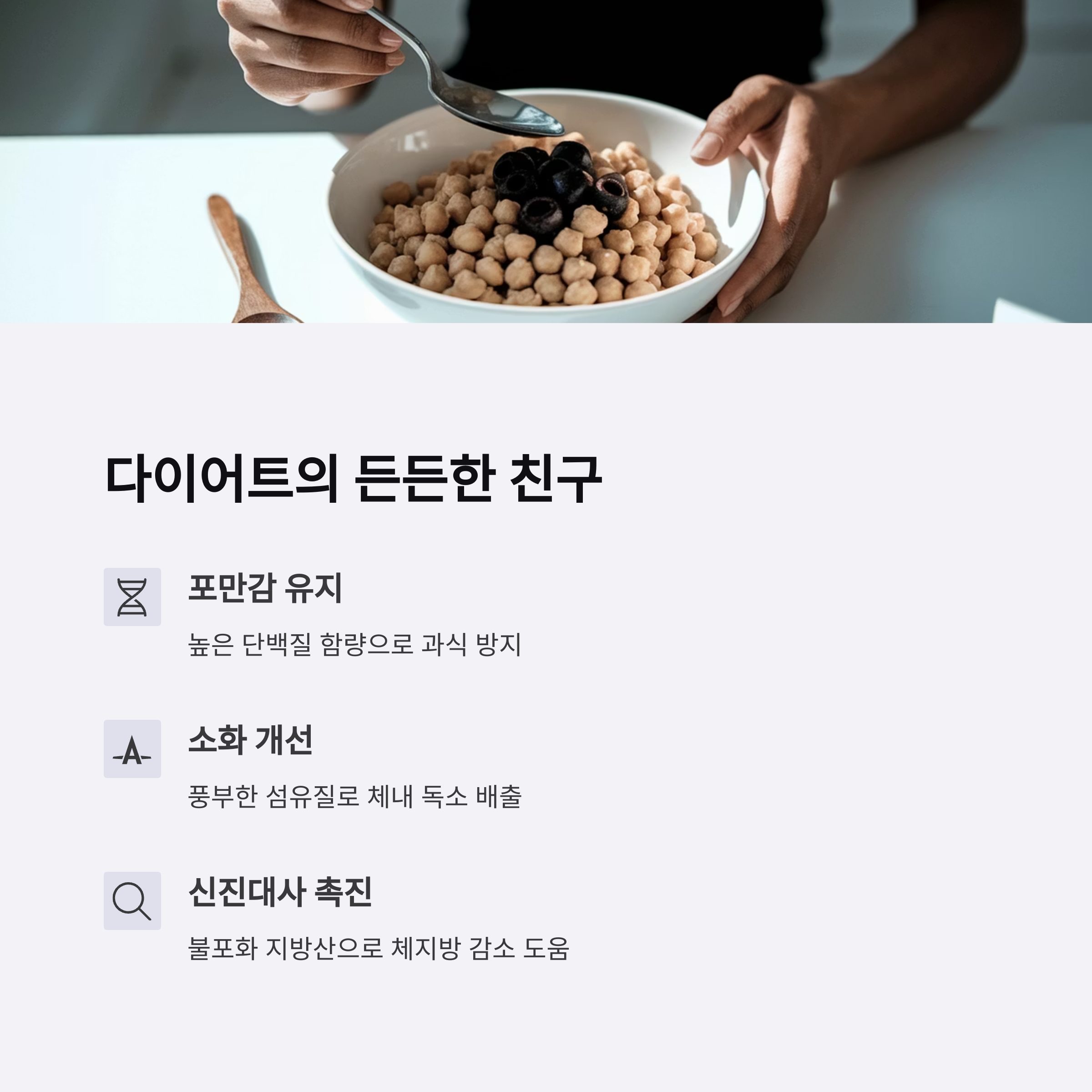 병아리콩은 낮은 GI(혈당 지수)와 높은 단백질 및 섬유질 함량으로 다이어트에 적합한 식품입니다.