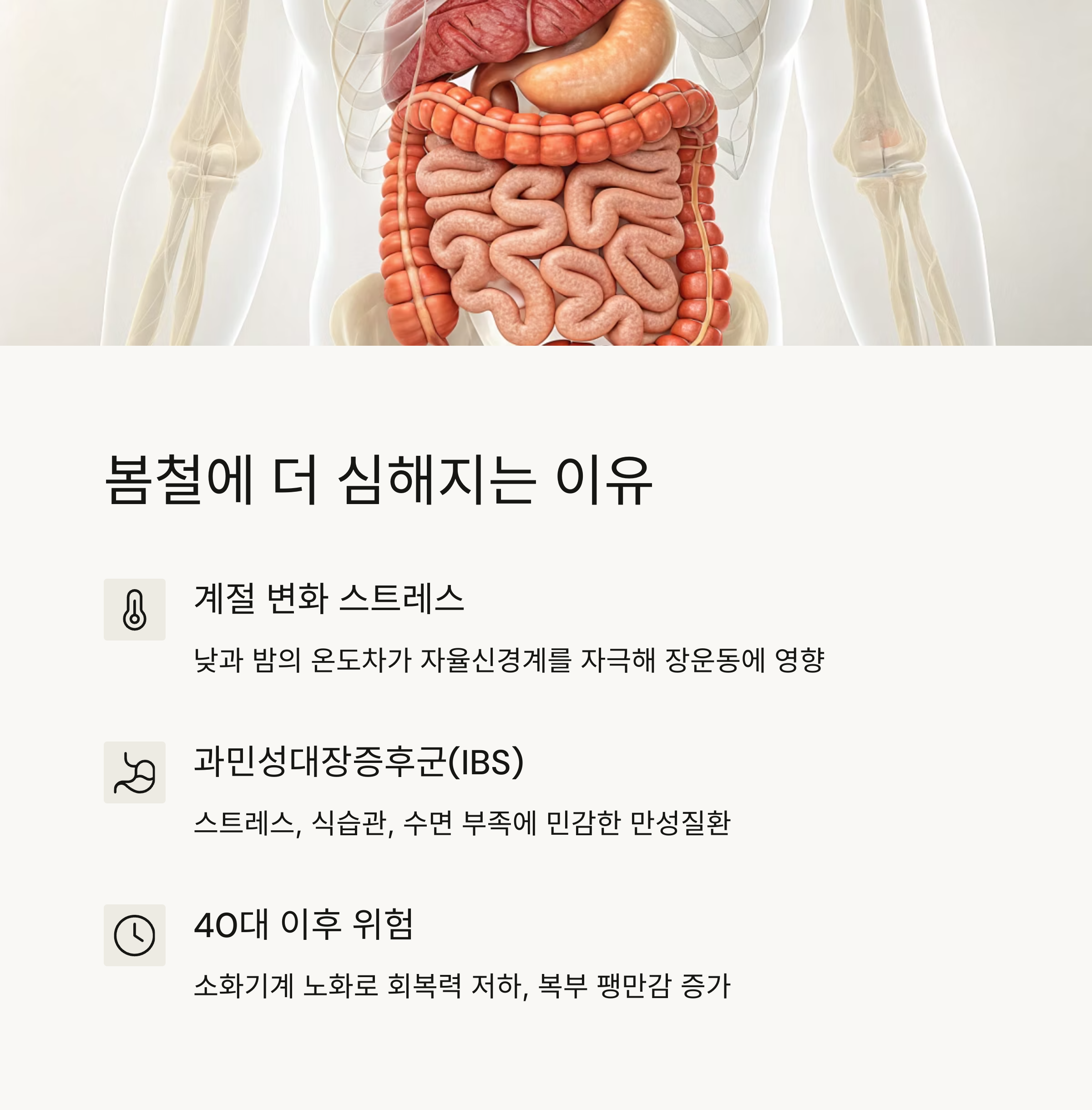 • 계절 변화 스트레스: 낮과 밤의 온도차, 새 계절 적응 스트레스가 자율신경계를 자극해 장운동에 영향을 줍니다.