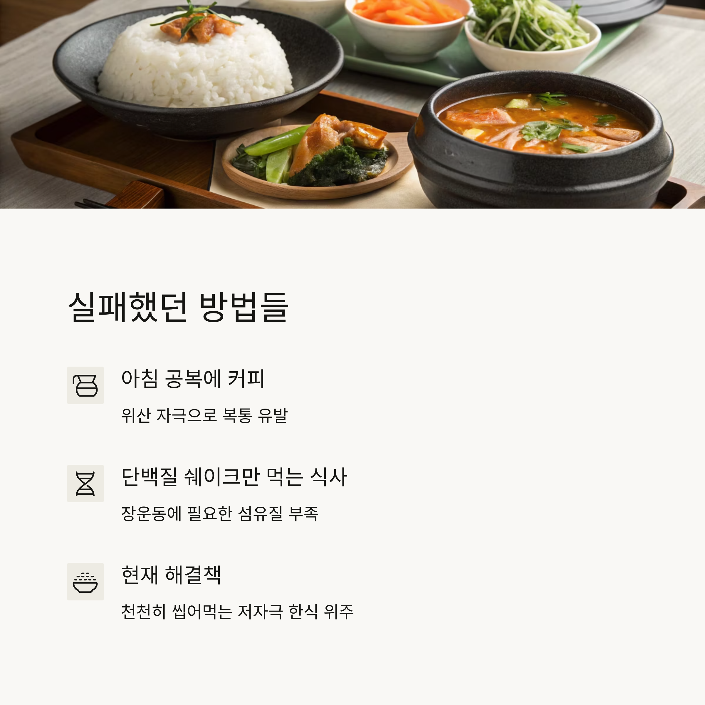 • 자극적인 음식(매운탕, 튀김류)은 줄이고 삶은 채소 + 된장국 위주
