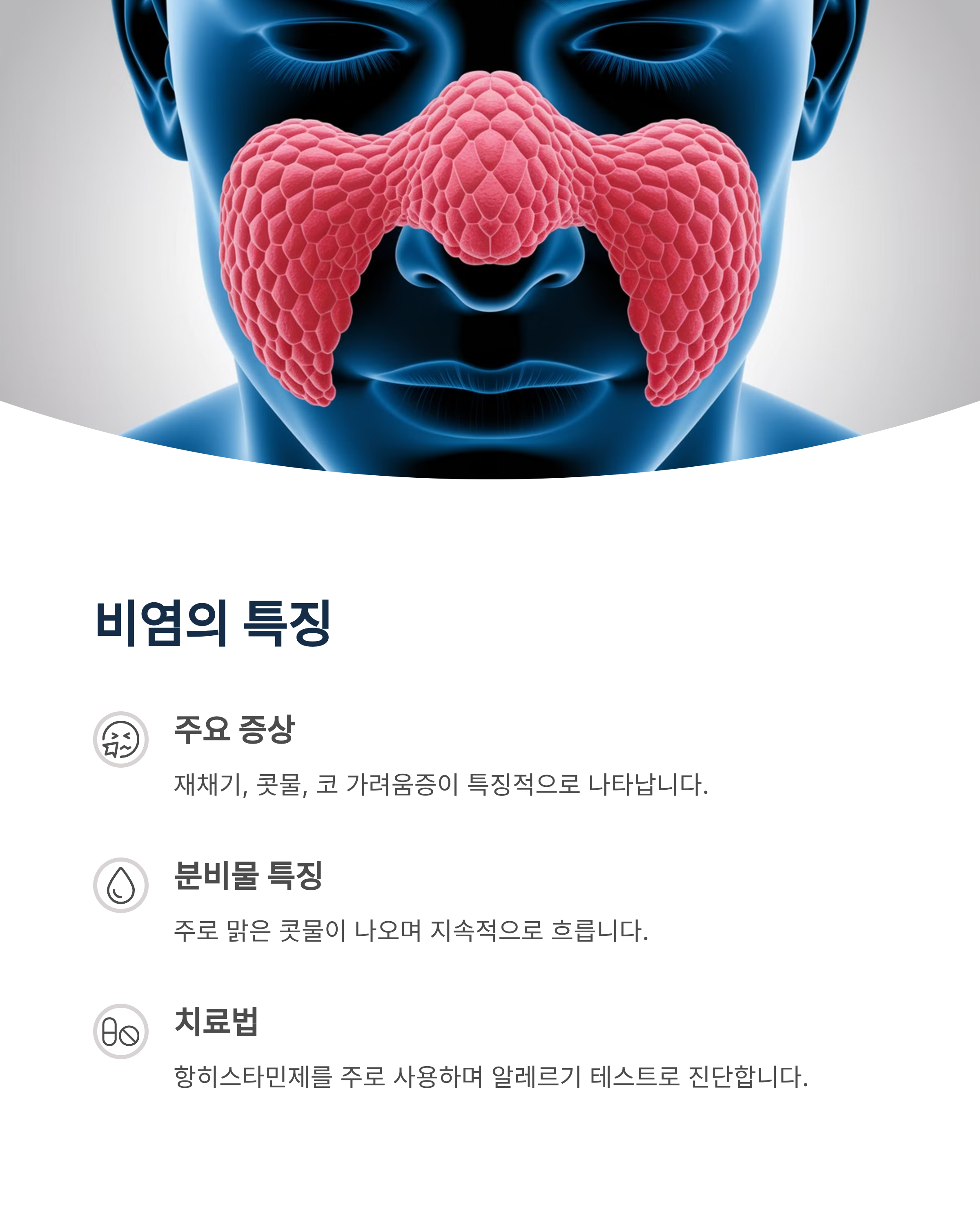 비염은 주로 콧물, 재채기, 코 가려움 등 코와 관련된 증상이 주를 이룹니다. 특히, 알레르기 비염일 경우 이러한 증상이 더욱 심해질 수 있습니다.
