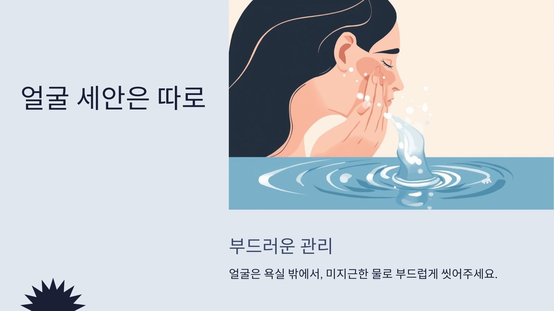 얼굴은 욕실 나와서, 미지근한 물과 세안제로 따로 관리해 주세요.