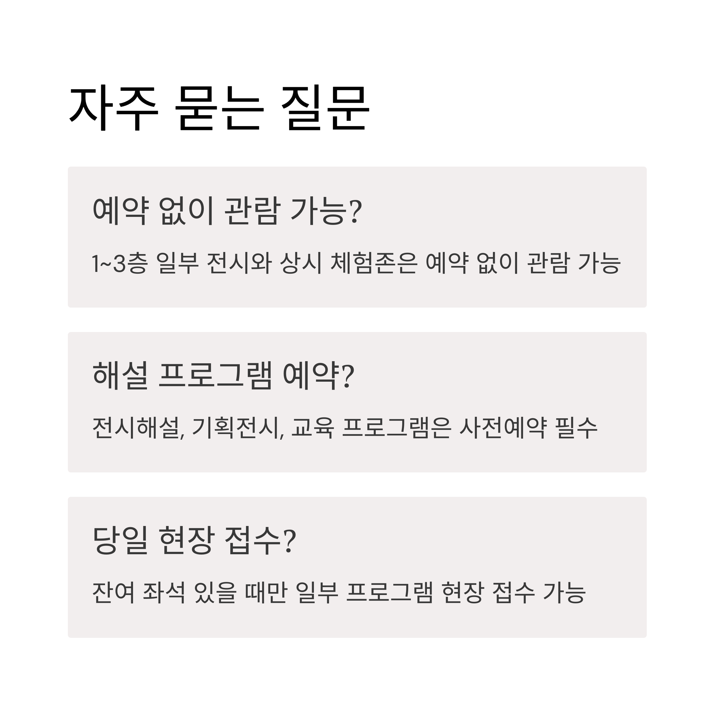 → 네, 1~3층 일부 전시와 상시 체험존은 예약 없이 관람할 수 있습니다. - Q. 해설 프로그램, 특별 체험은 꼭 예약해야 하나요?