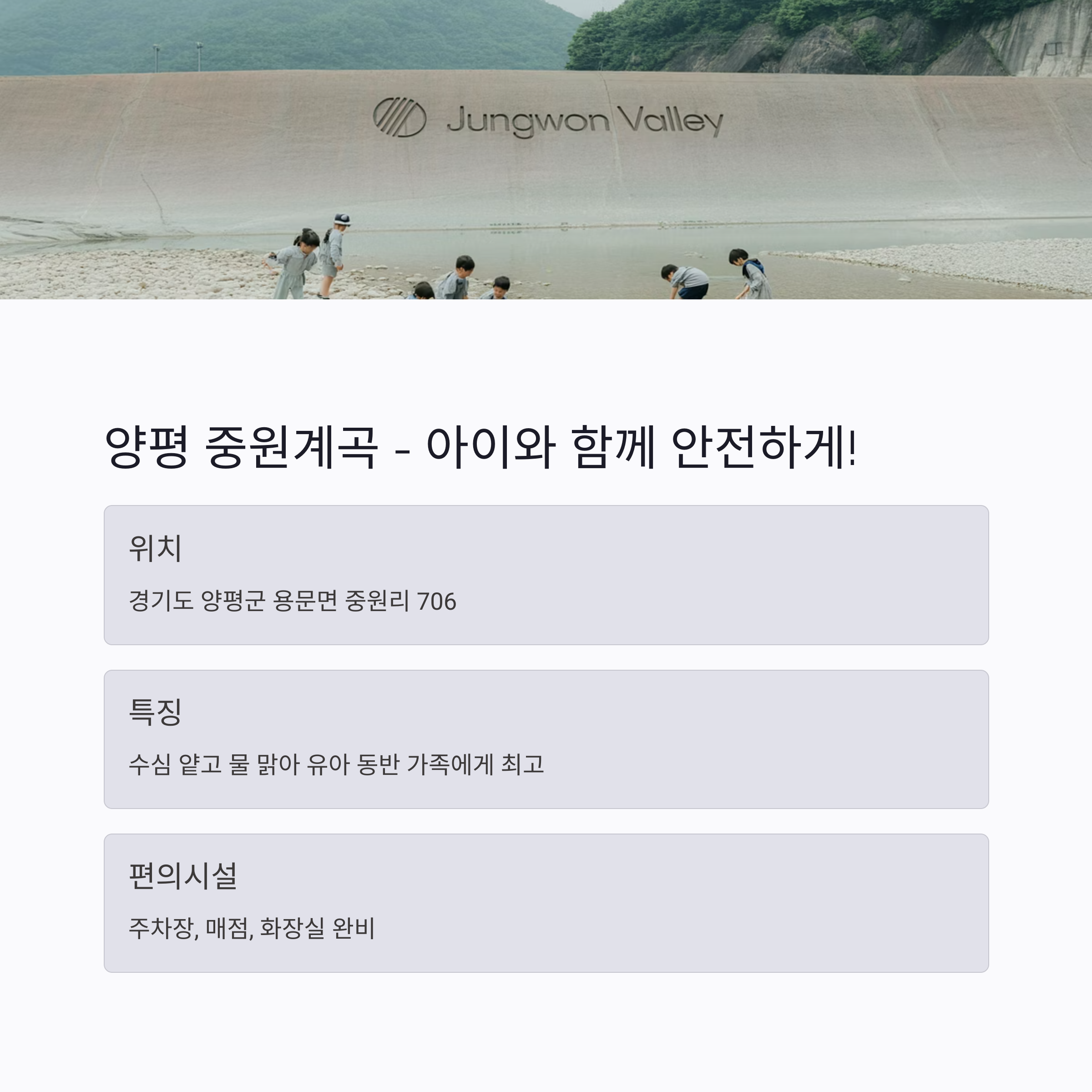 | 중원계곡 | 양평 용문면 | 얕은 수심, 아이와 안전한 물놀이 |