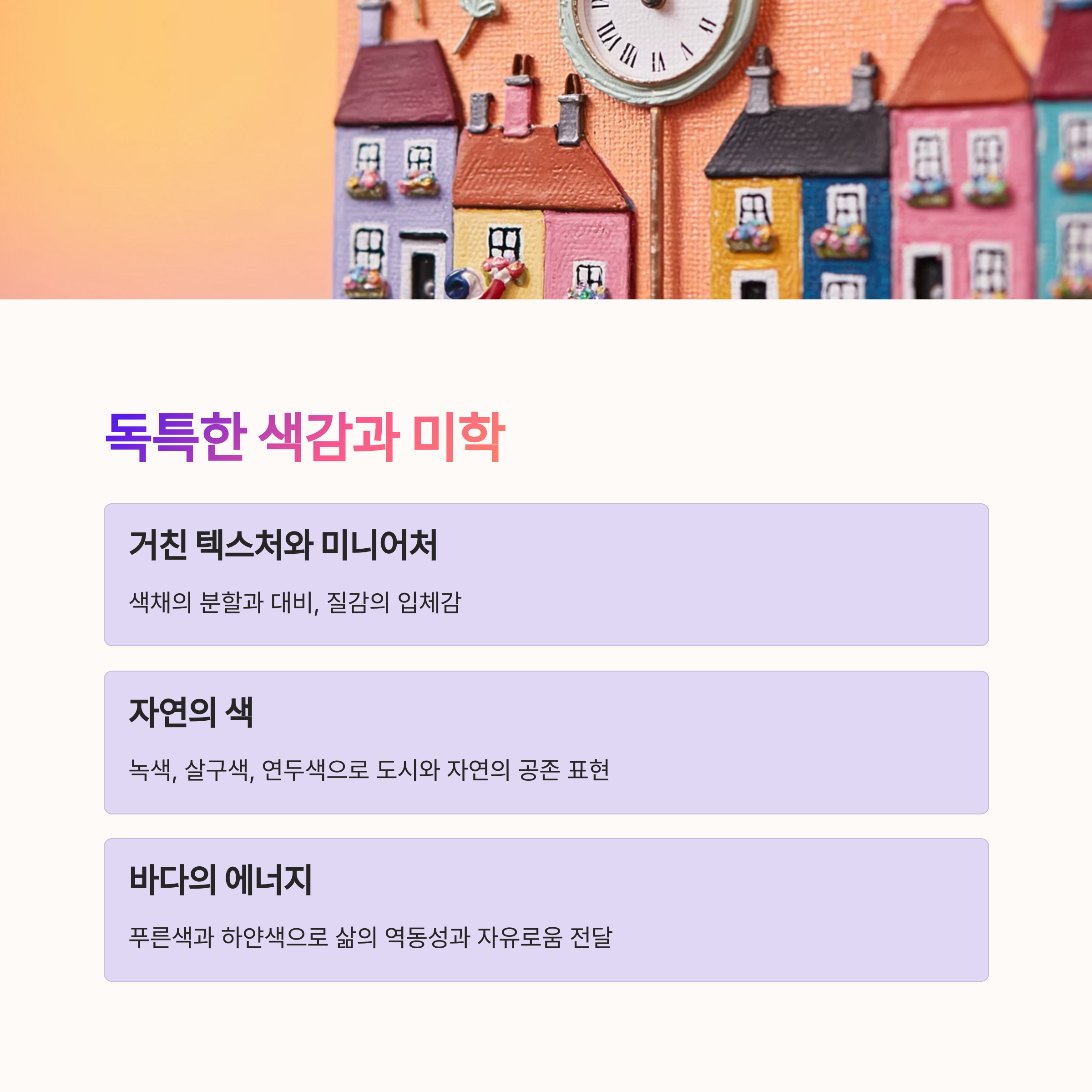 이번 전시의 가장 큰 특징은 색감과 텍스처의 미학입니다. 거칠고 두꺼운 붓 터치 위에 배치된 미니어처 인물들은 작가가 표현하고자 한 기억과 감정의 흔적을 더욱 선명하게 전달합니다. 'Forbidden Grass'에서는 연두와 살구색의 자연색이 도시와의 대비를 통해 생명력을 드러내고, 'The wet'에서는 푸른 바다의 움직임이 자유롭고 역동적으로 표현됩니다. 각각의 시리즈는 색채로 공간을 분할하고, 시선의 흐름을 유도하여 관람객의 몰입도를 높입니다.