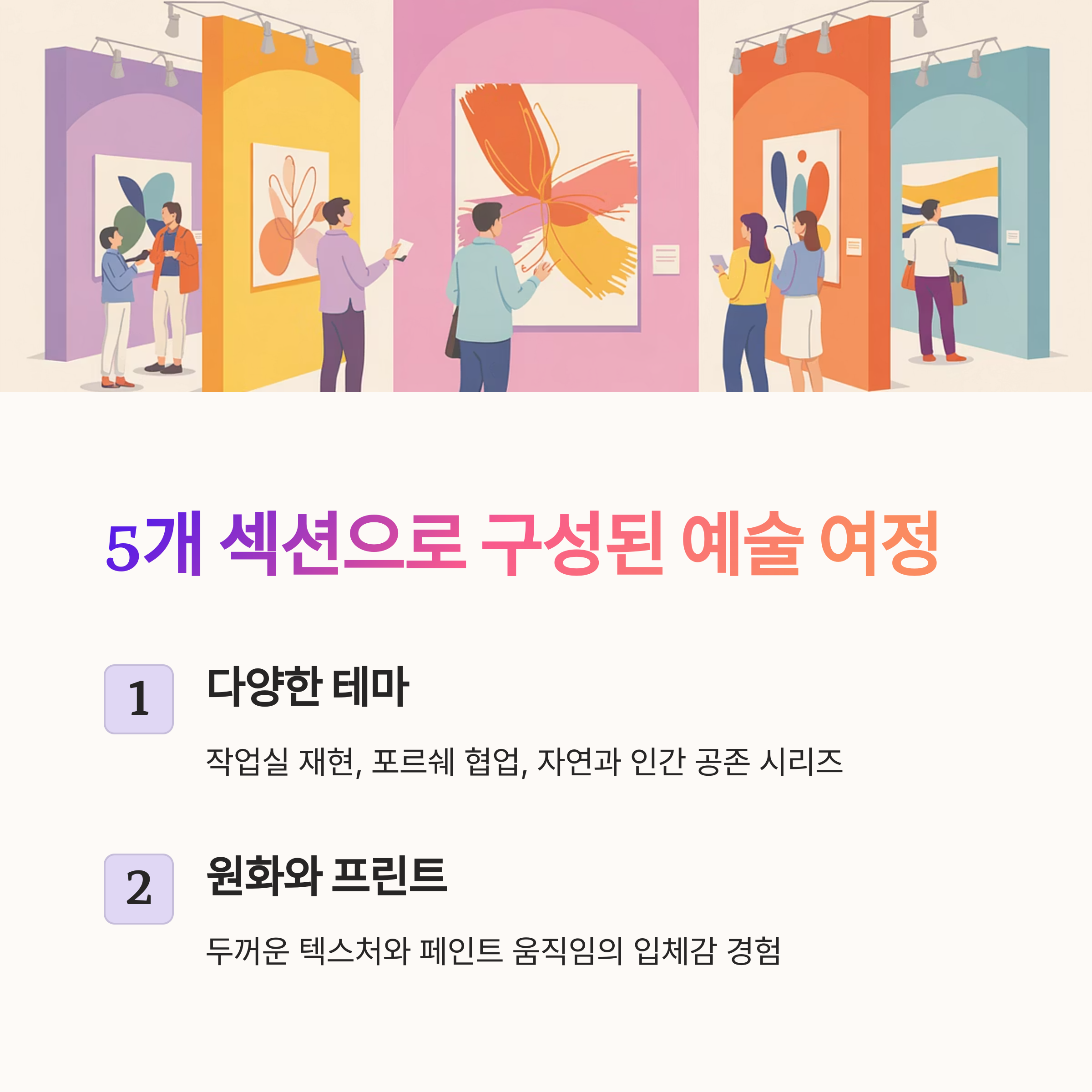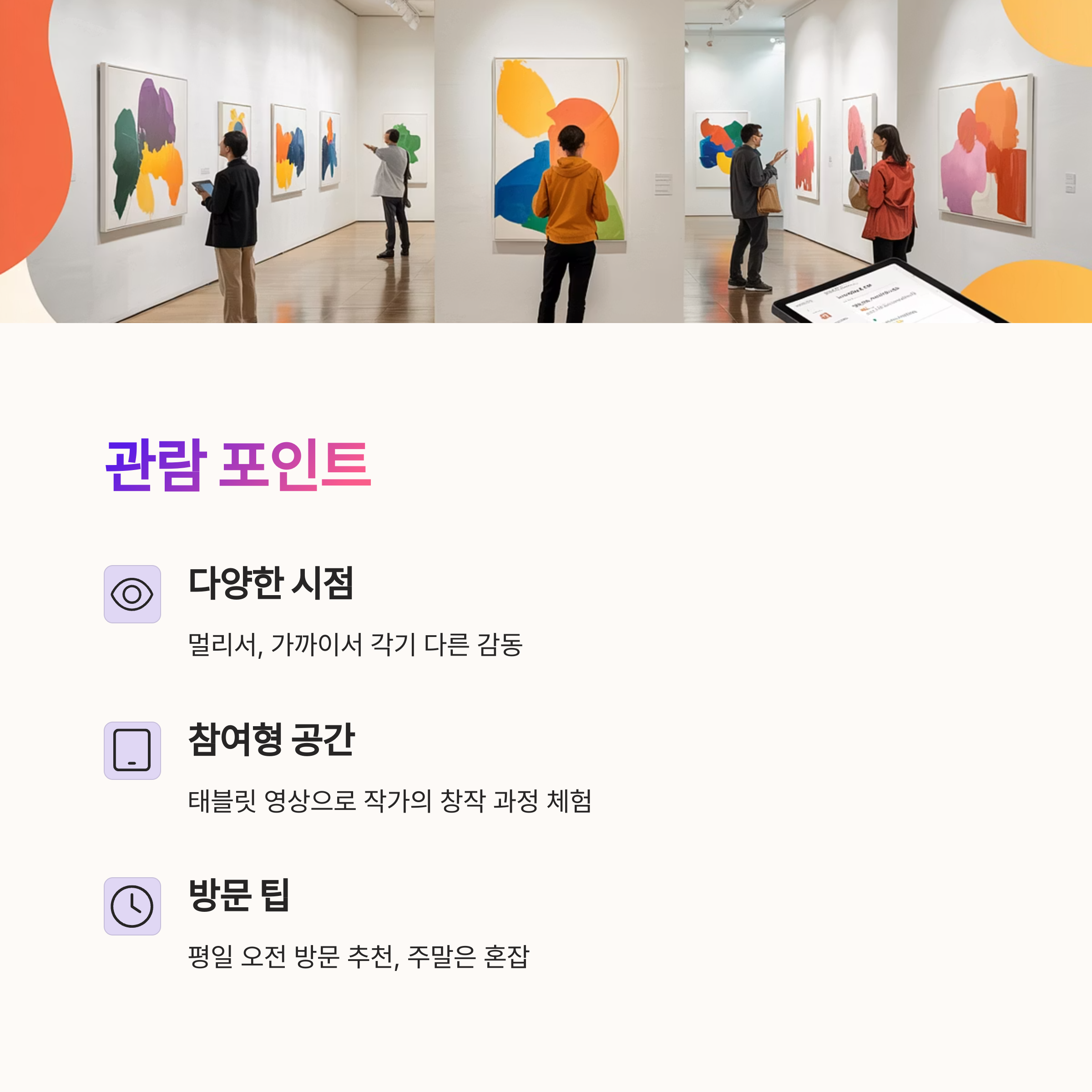 관람 포인트는 가까이에서 작품을 볼 때 더욱 살아납니다. 질감, 붓결, 인물의 표정까지 정교하게 표현된 회화들은 멀리서 볼 때와는 전혀 다른 감동을 줍니다. 또한, 전시장 내에는 태블릿 영상과 체험 공간이 있어 작가의 창작 과정까지 함께 체험할 수 있는 구성으로 관람객의 만족도를 높였습니다. 주말보다는 평일 오전에 여유롭게 감상하는 것을 추천드립니다.