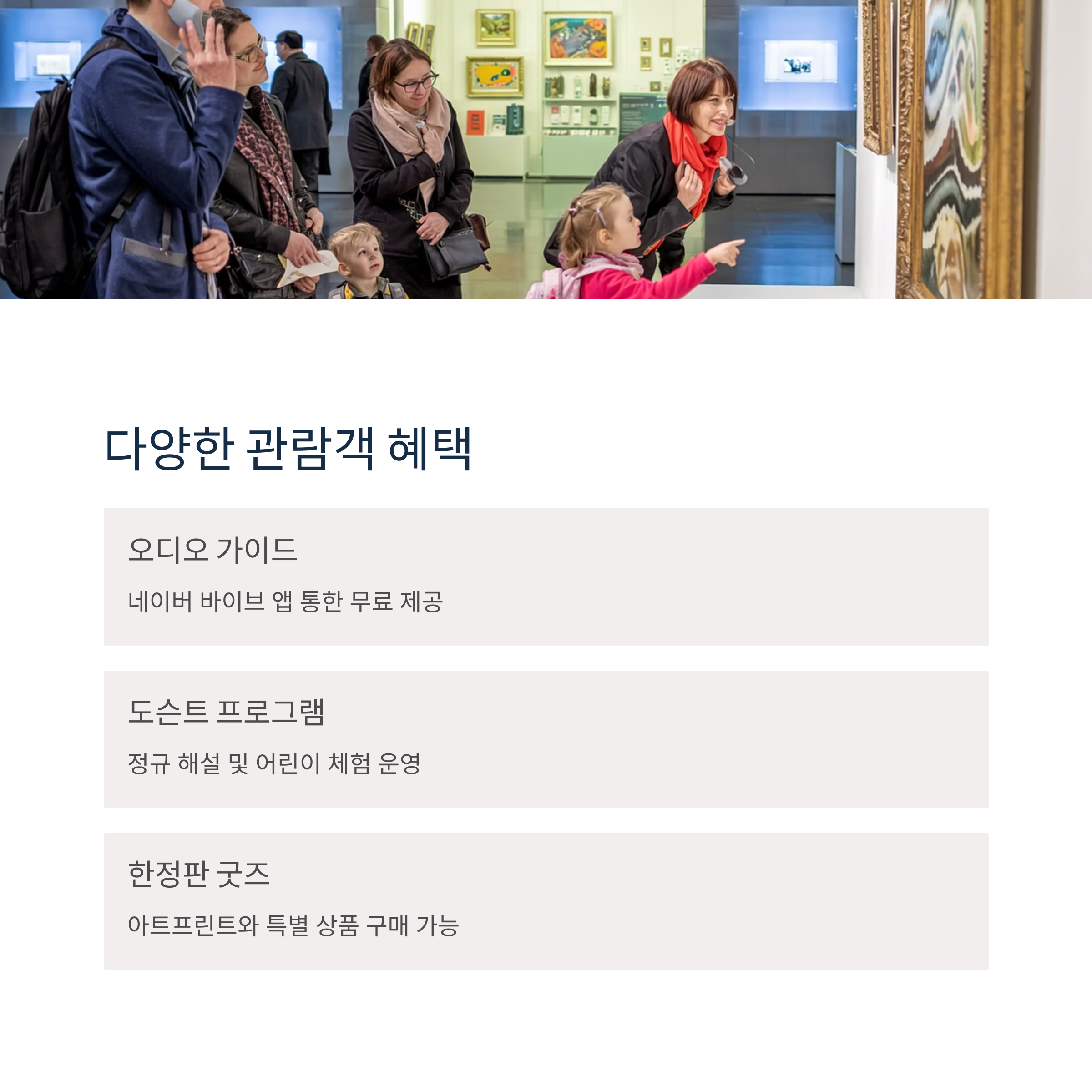 전시 관람객을 위한 혜택도 다양합니다. 네이버 바이브 앱을 통한 무료 오디오 가이드 제공과 함께, 정규 도슨트 프로그램 및 어린이 체험 프로그램이 운영되어 온 가족이 함께 관람하기에 적합합니다. 또한 전시 종료 후에는 한정판 굿즈와 아트프린트를 구매할 수 있는 굿즈샵이 운영되어, 소장가치를 더합니다.