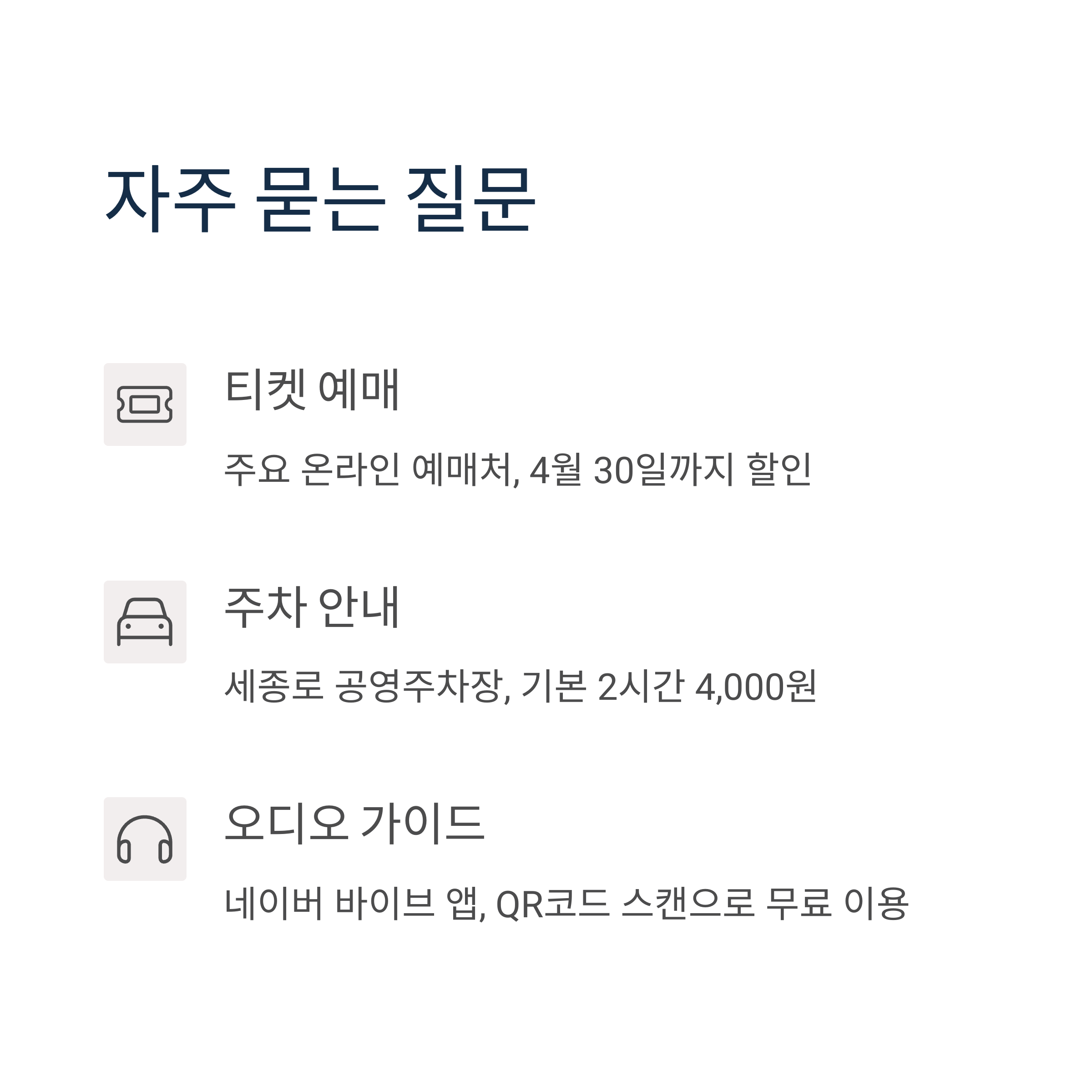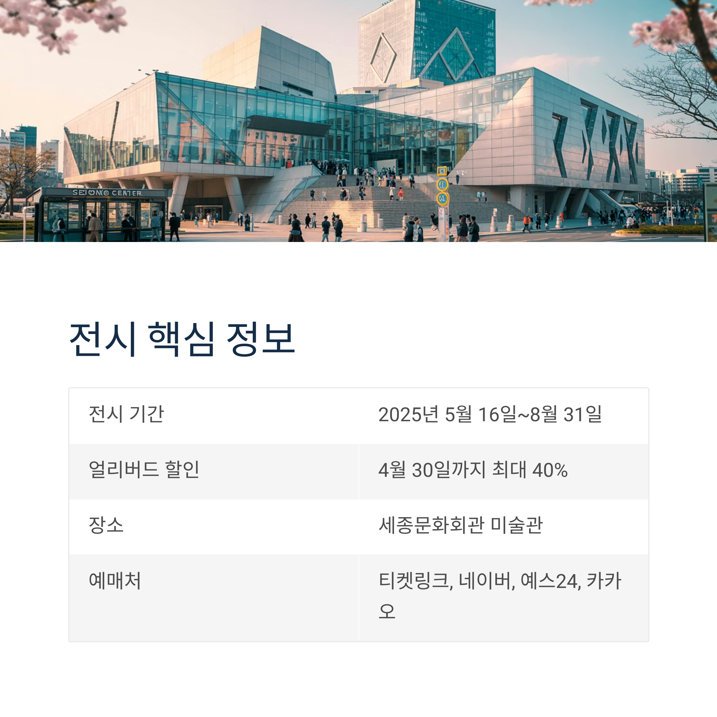 | 2025년 5월 16일 ~ 8월 31일 | 4월 30일까지 최대 40% 할인 | 무료 오디오가이드, 도슨트, 굿즈샵 운영 |