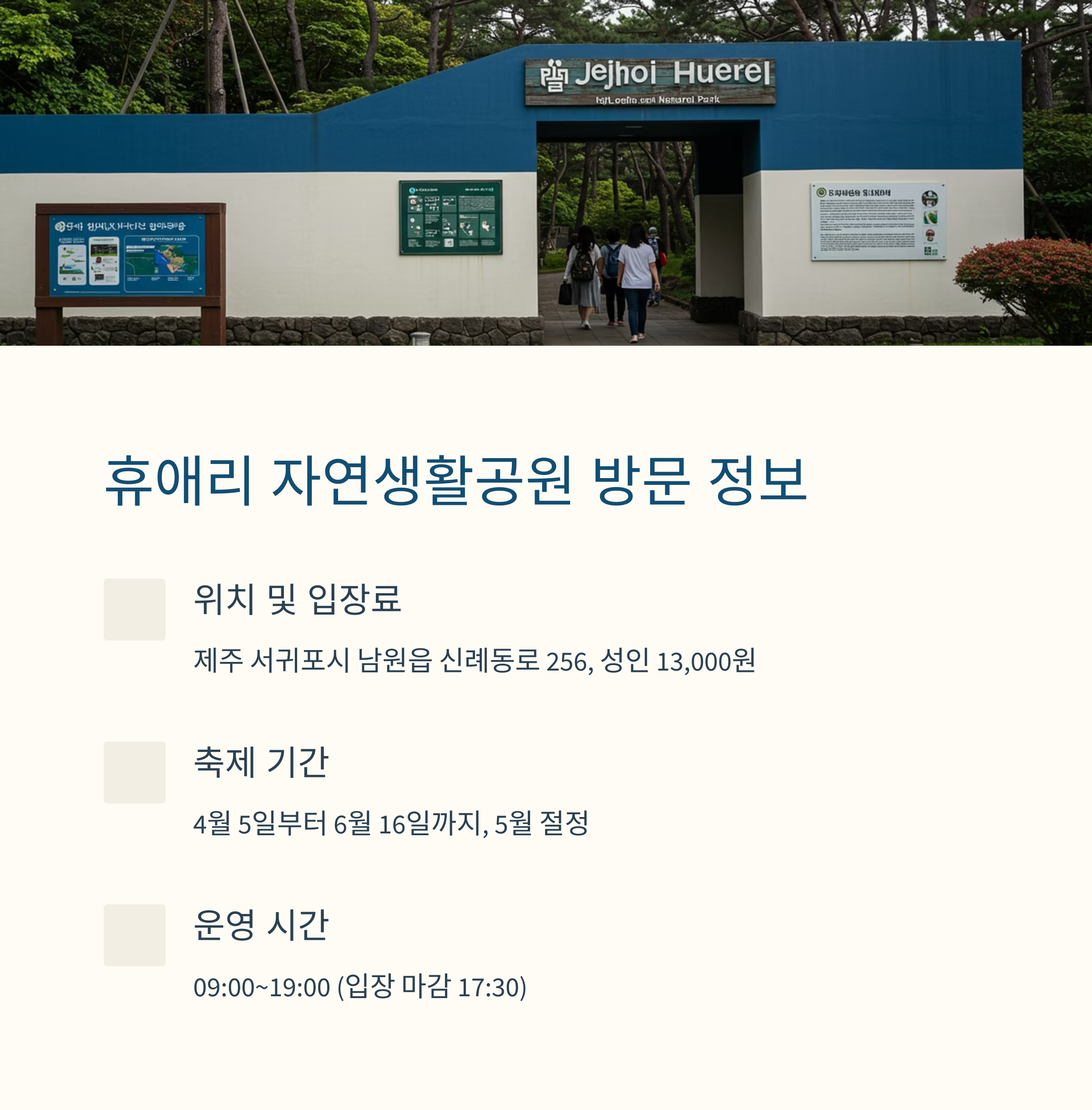 09:00~19:00 (입장 마감 17:30)          넓은 무료 주차장          마노르블랑 수국 카페          서귀포 호캉스 숙소
