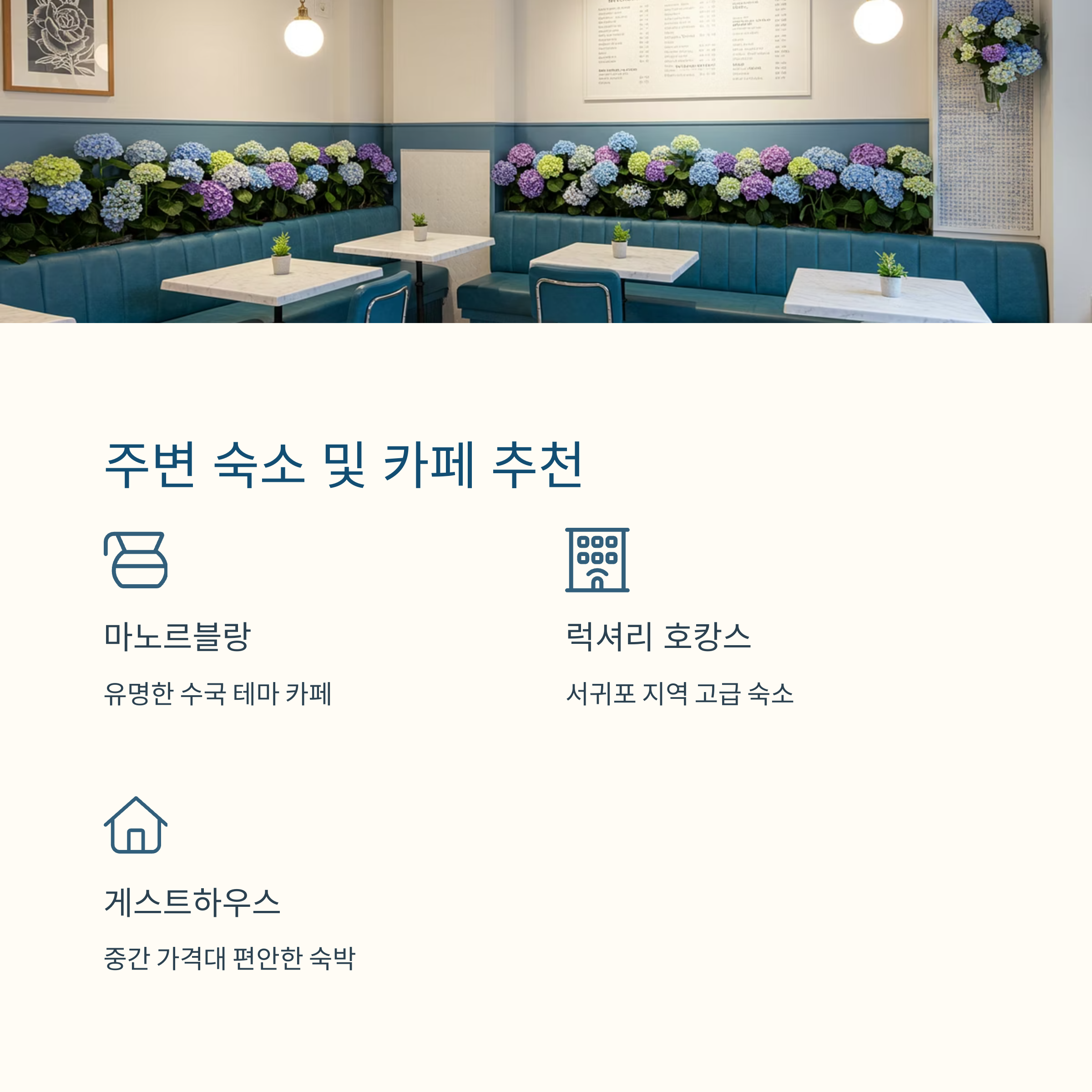 주변의 마노르블랑 카페와 고급스러운 서귀포 숙소도 방문 일정을 풍성하게 만들어줍니다.