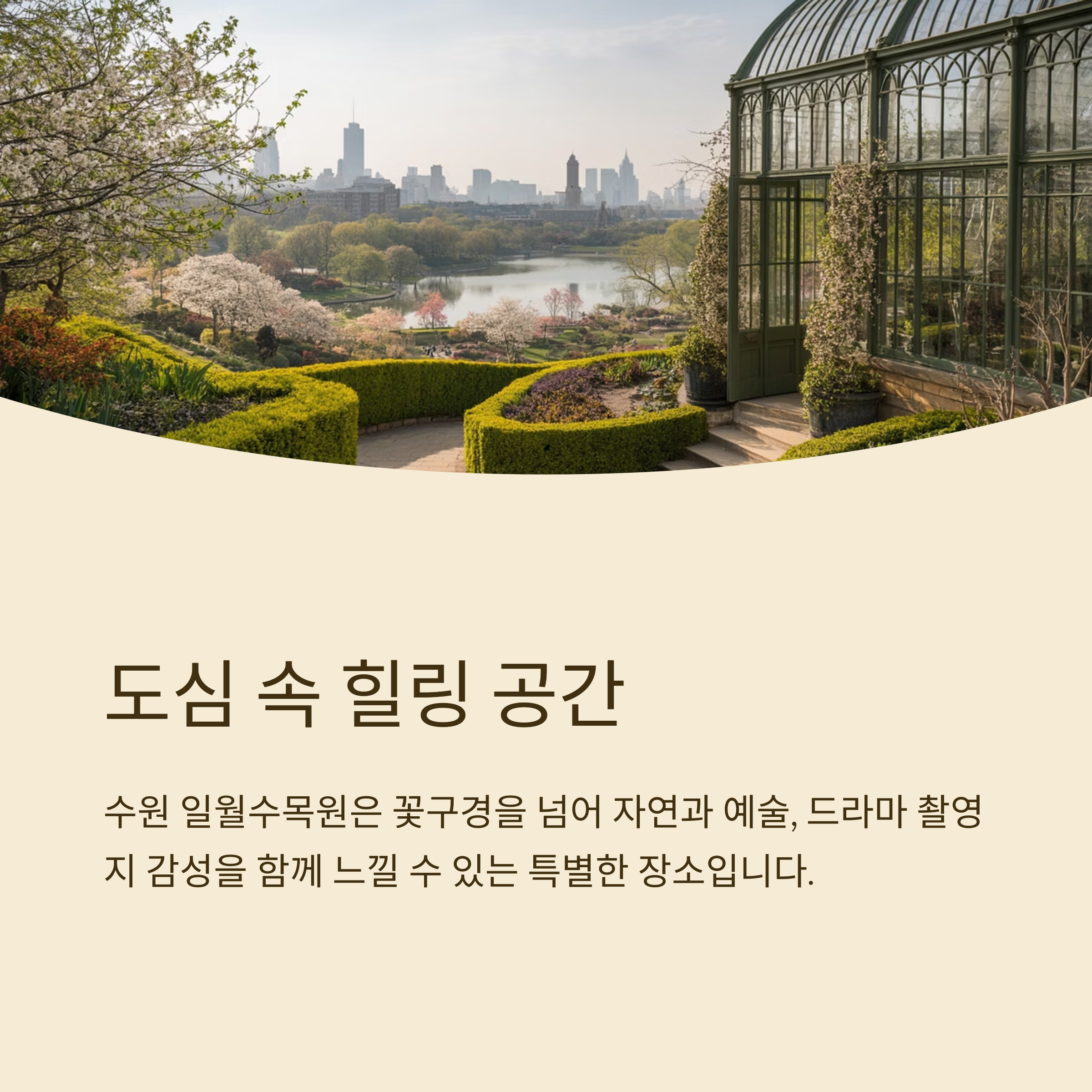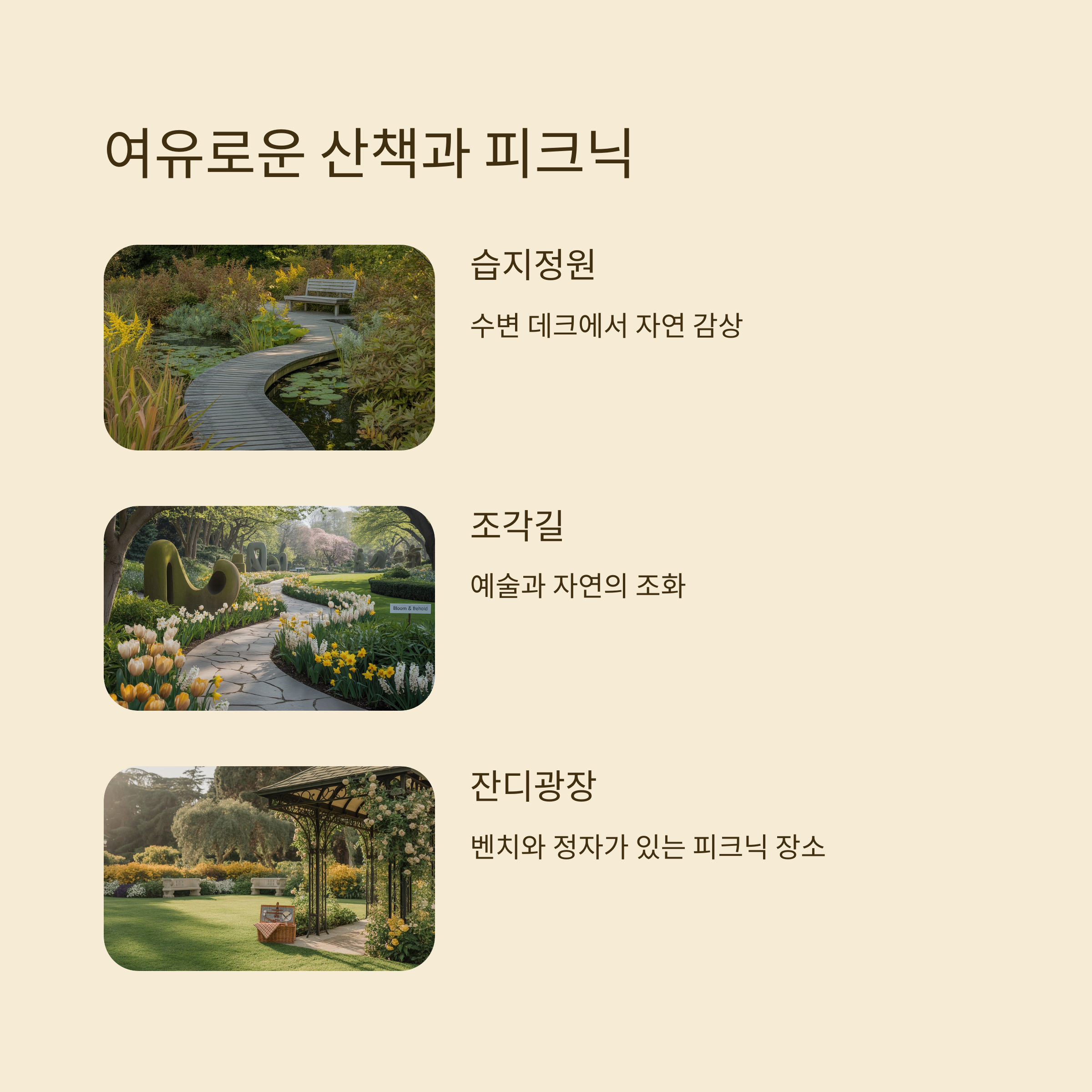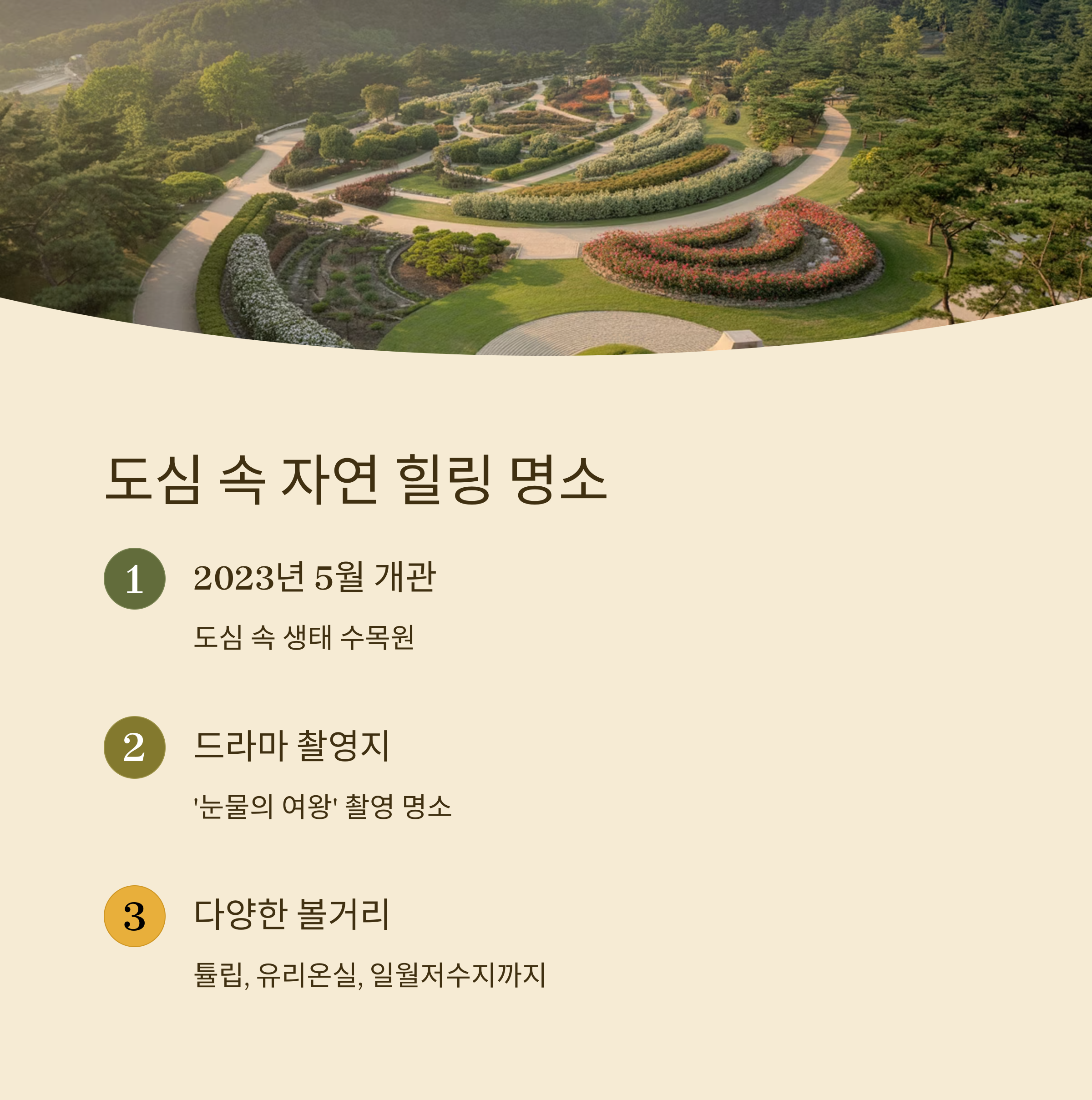 - 주요 시설: 16개 테마정원, 전시온실, 산책로, 잔디광장