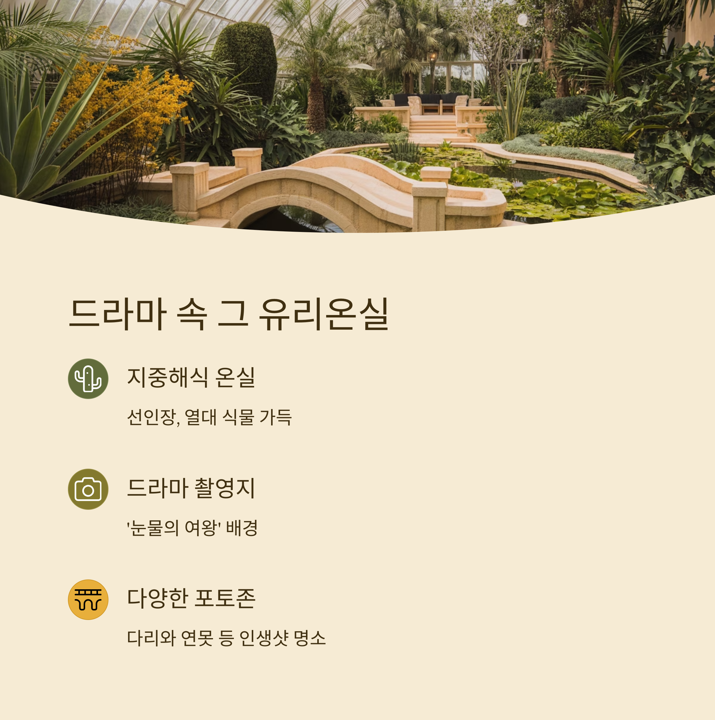 지중해식 온실, 선인장, 열대 식물 등 이국적인 분위기가 가득한 공간이에요.