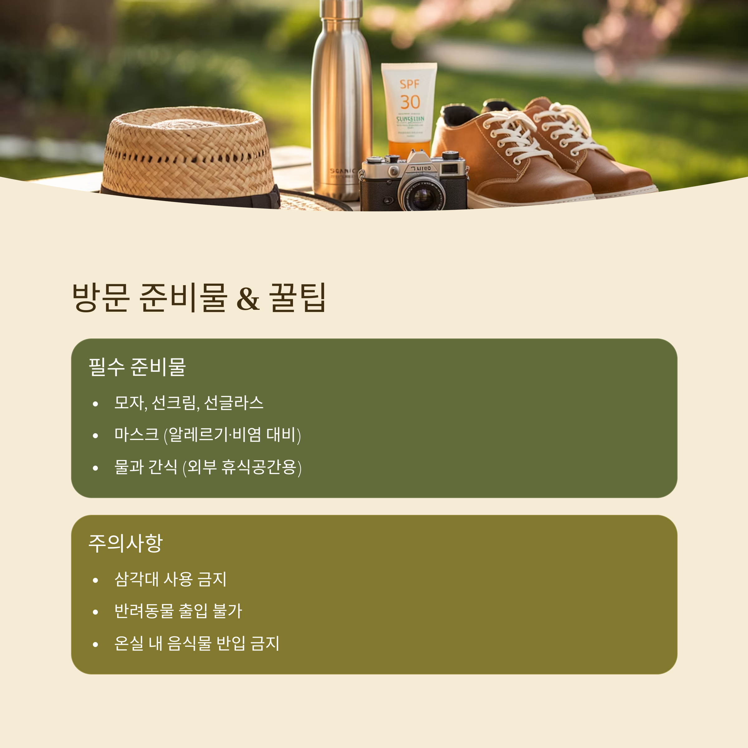 - 간단한 물과 개인 간식: 내부 음식물은 반입 금지지만 외부 휴식 공간 활용 가능