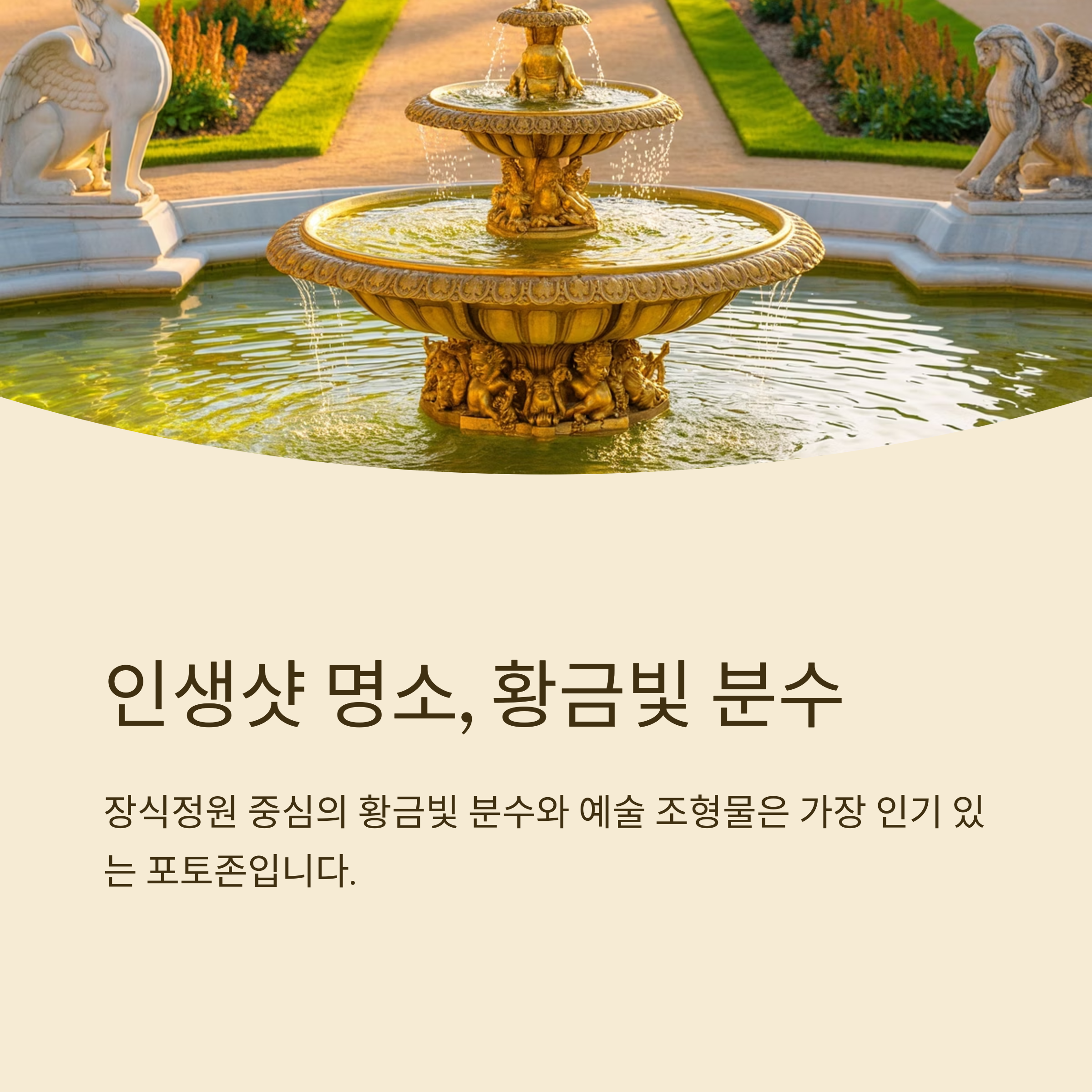 장식정원 중심에 있는 황금빛 분수와 예술 조형물은