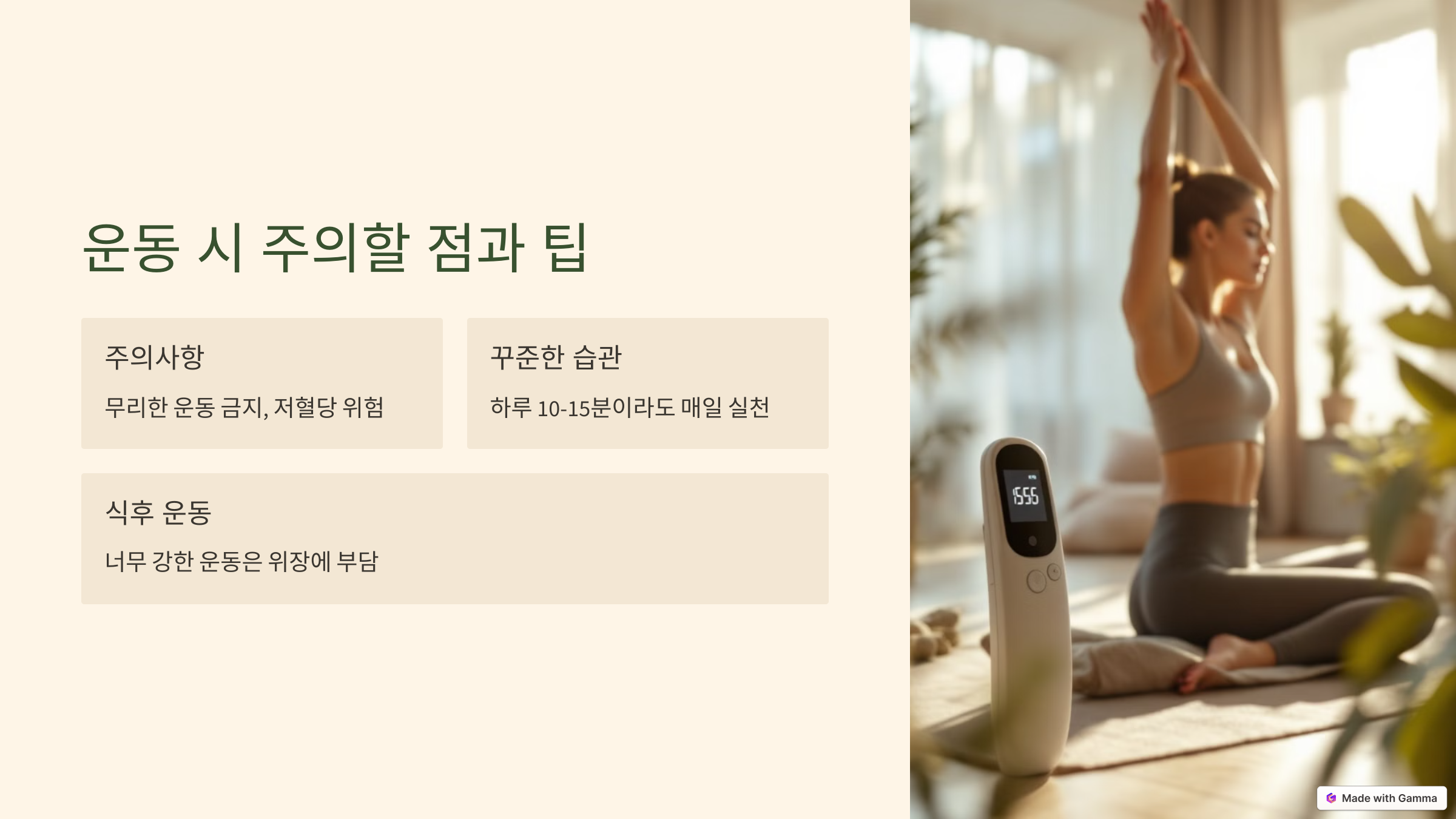 짧은 고강도 운동은 혈당을 빠르게 떨어뜨리지만, 갑자기 강한 운동을 하면 부담이 될 수 있으니 본인의 체력에 맞춰 조절하세요!