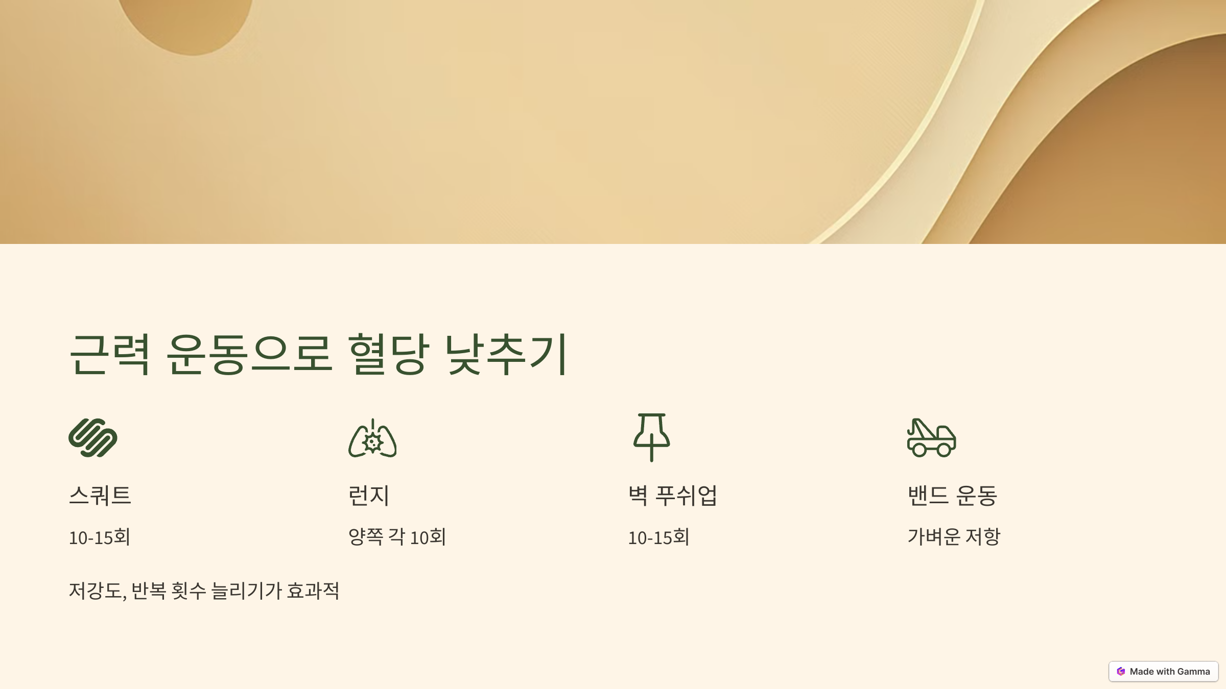 근력 운동은 식사 후 30분~1시간 후에 가볍게 하는 것이 좋아요. 무거운 중량보다는 저강도, 반복 횟수를 늘리는 방식이 혈당 조절에 효과적입니다.