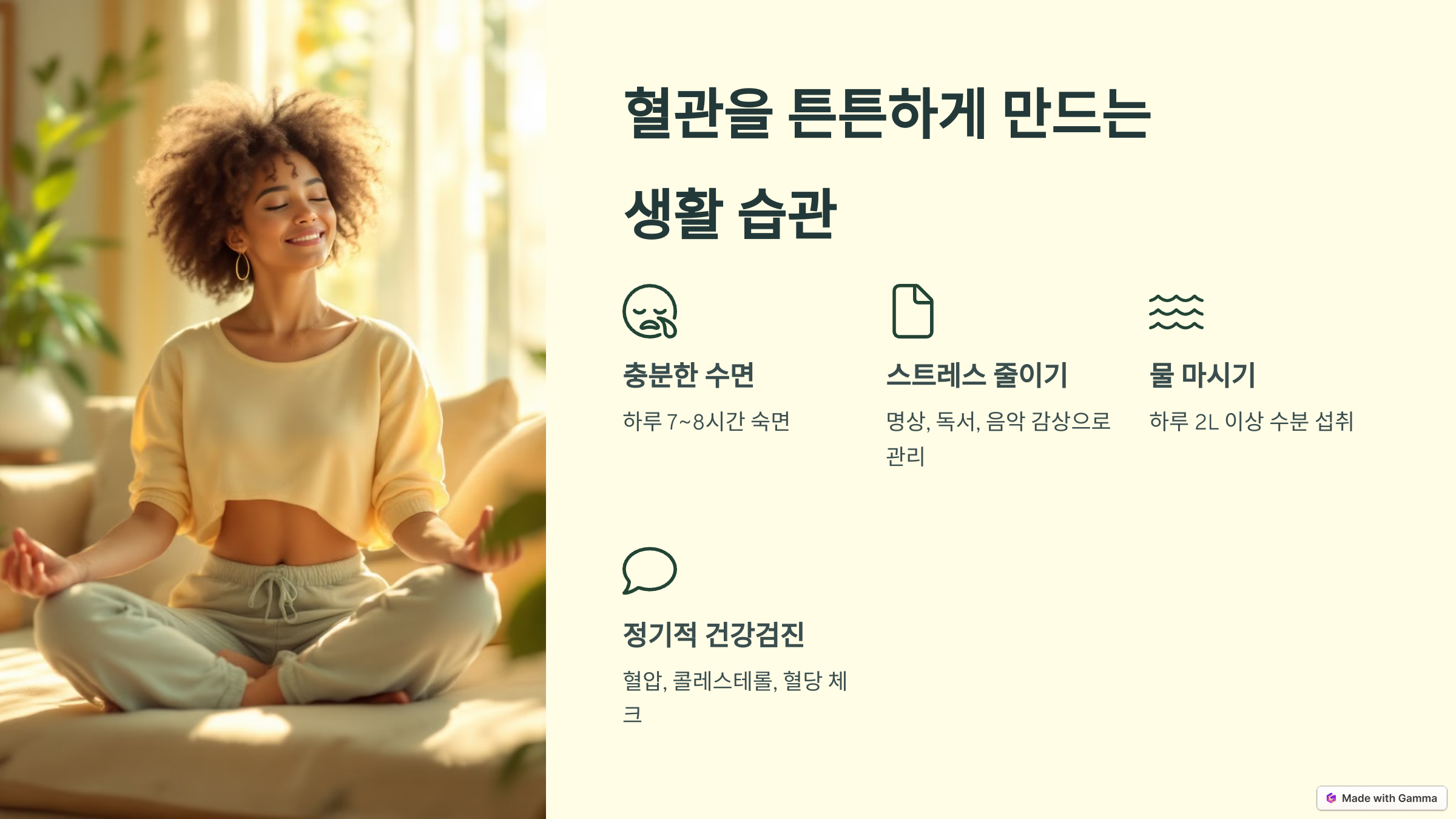 - 하루 7~8시간 숙면을 취하면 혈관 건강에 긍정적인 영향을 줍니다.