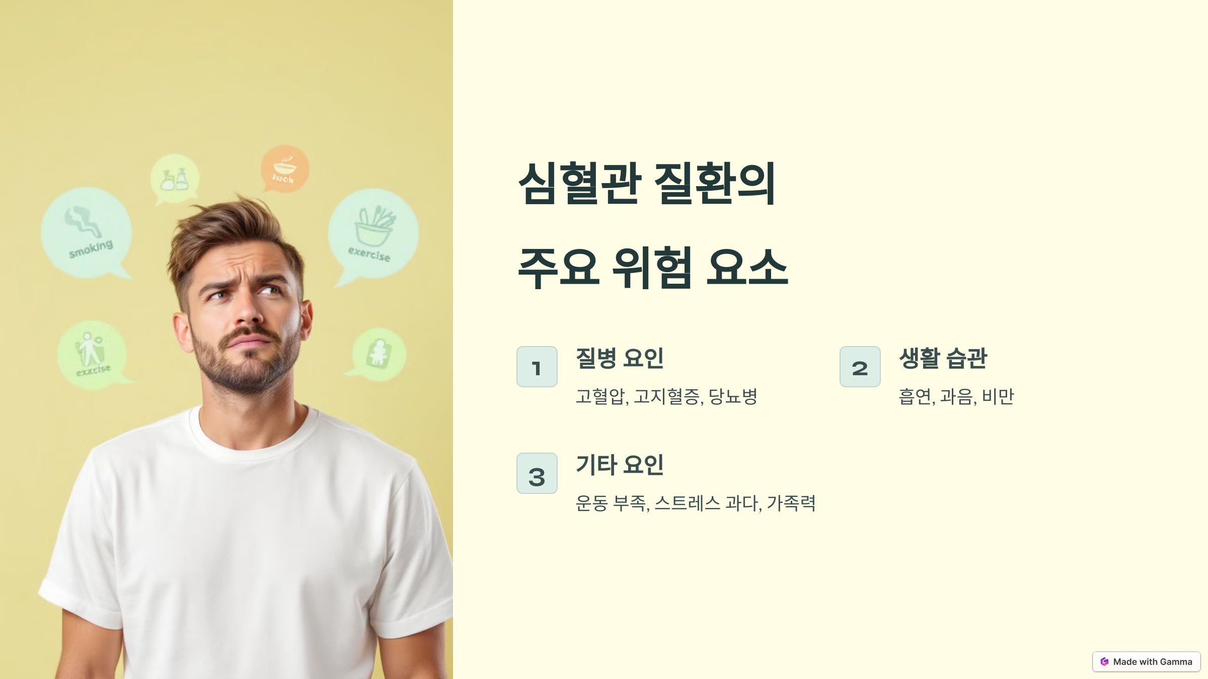 - 금연과 절주를 실천하면 심혈관 질환 위험을 크게 낮출 수 있습니다.