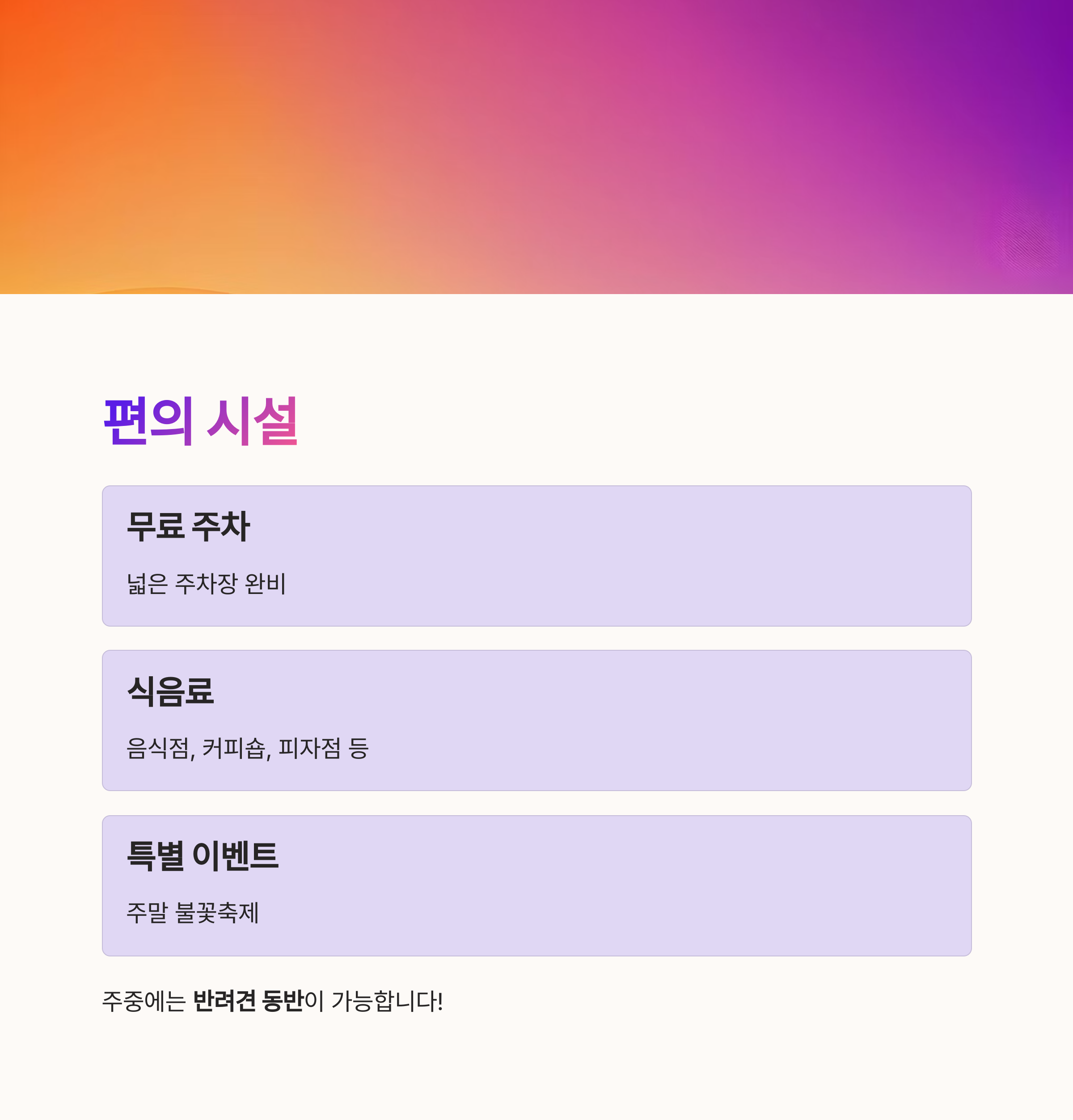다양한 부대시설분과 무료 주차까지 갖추어 편리하게 즐길 수 있습니다.